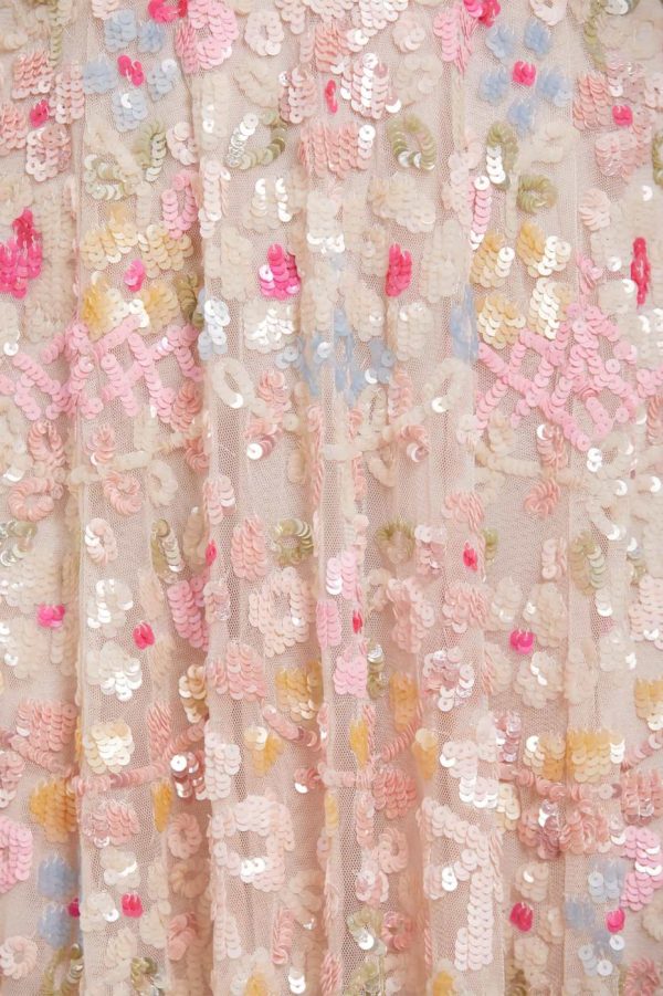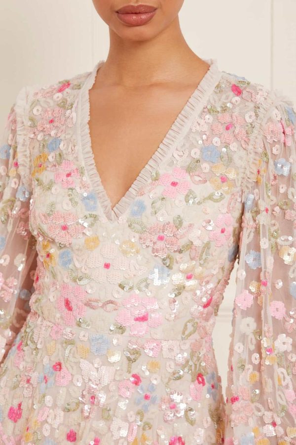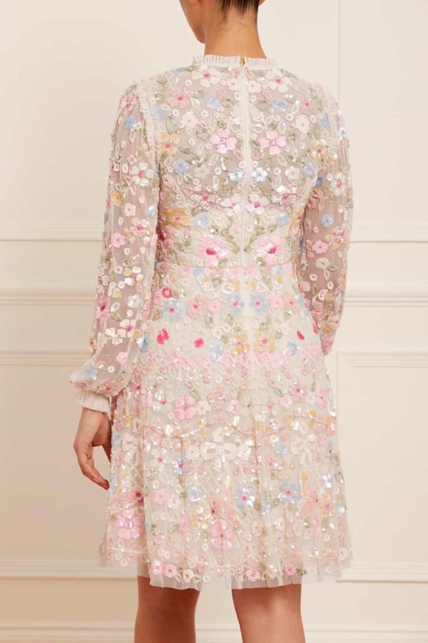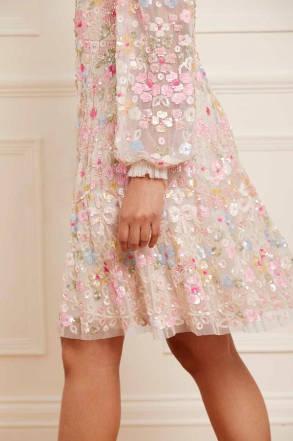 The Shimmer Fairytale V-Neck Mini Dress in Cream. Intricately adorned with a multi-coloured floral and ribbon artwork with shimmering sequins to create a romantic look. Beautifully designed with long sleeves, a round neckline and Needle & Thread signature detailing. This mini dress is developed with a tulle net skirt to create a flattering silhouette. The ultimate fairytale piece.