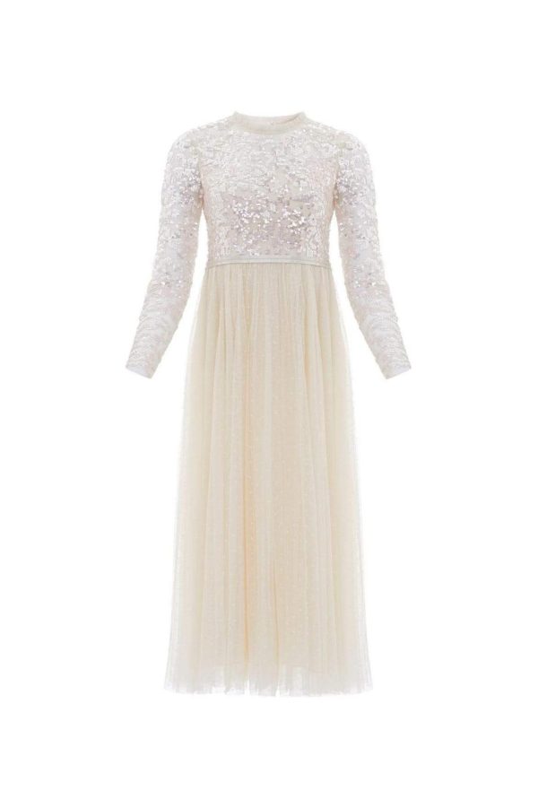 The Tempest Bodice Ballerina Dress in Champagne / Pink. This beautiful ballerina dress is inspired by a vintage lace tablecloth design, embellished with shimmering pink sequins all over the bodice. Designed with long sleeves, a kisses tulle multi-layered skirt, and frill trim detailing around the neck. Make an entrance in the Tempest.