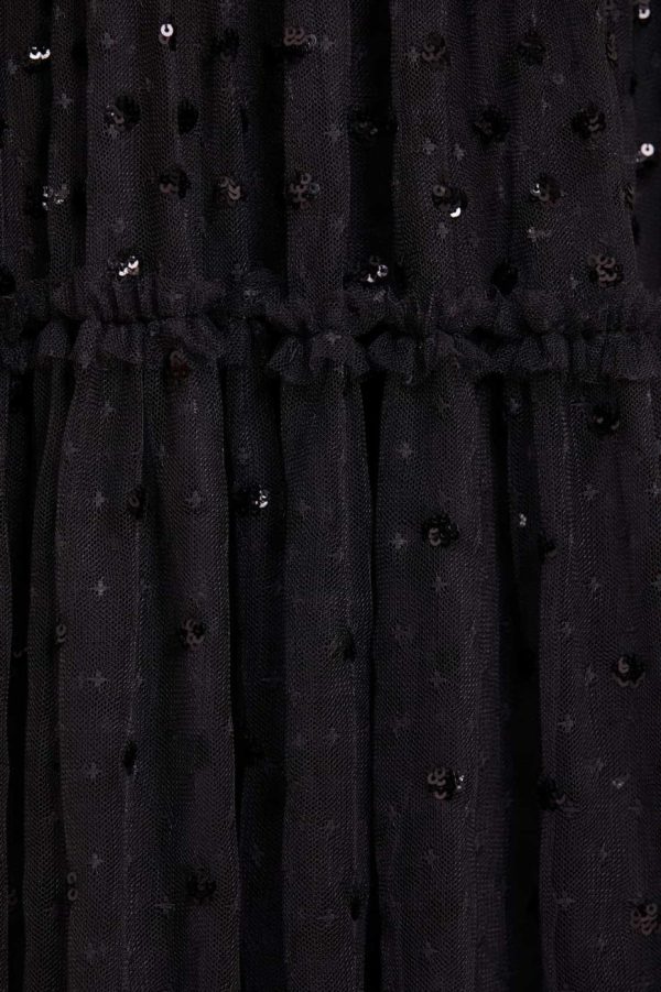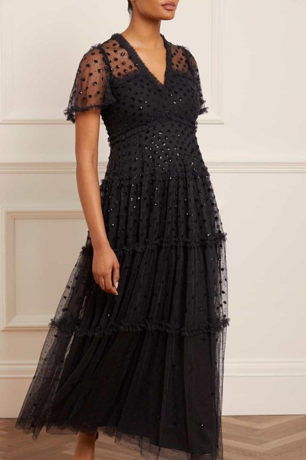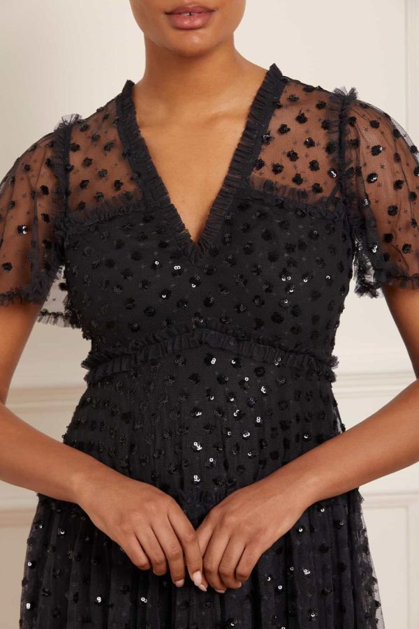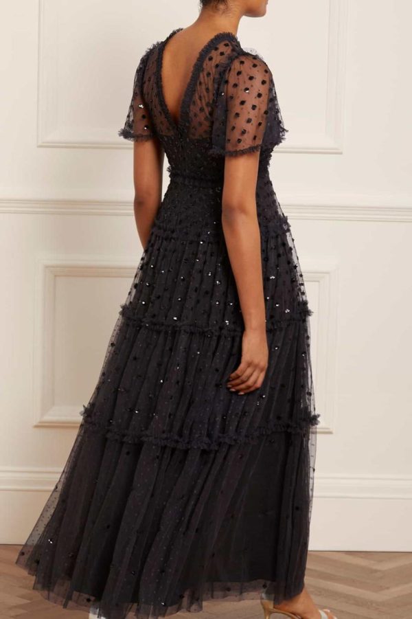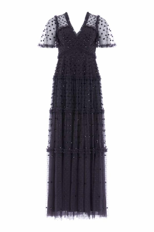 The Thea Gown in Graphite / Black. This gown is scattered with polka dot sequin motifs to create an enchanting shimmer throughout. Developed with signature Needle & Thread ‘x’ motif tulle adding subtle detail. Make a special appearance in the Thea at your next event.