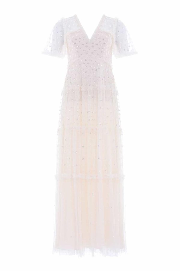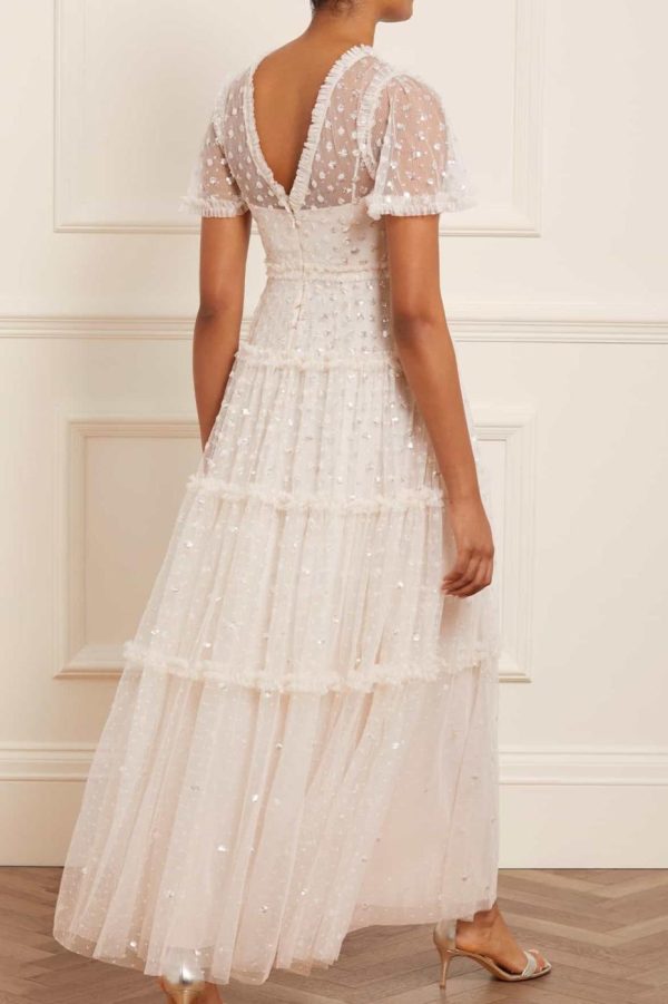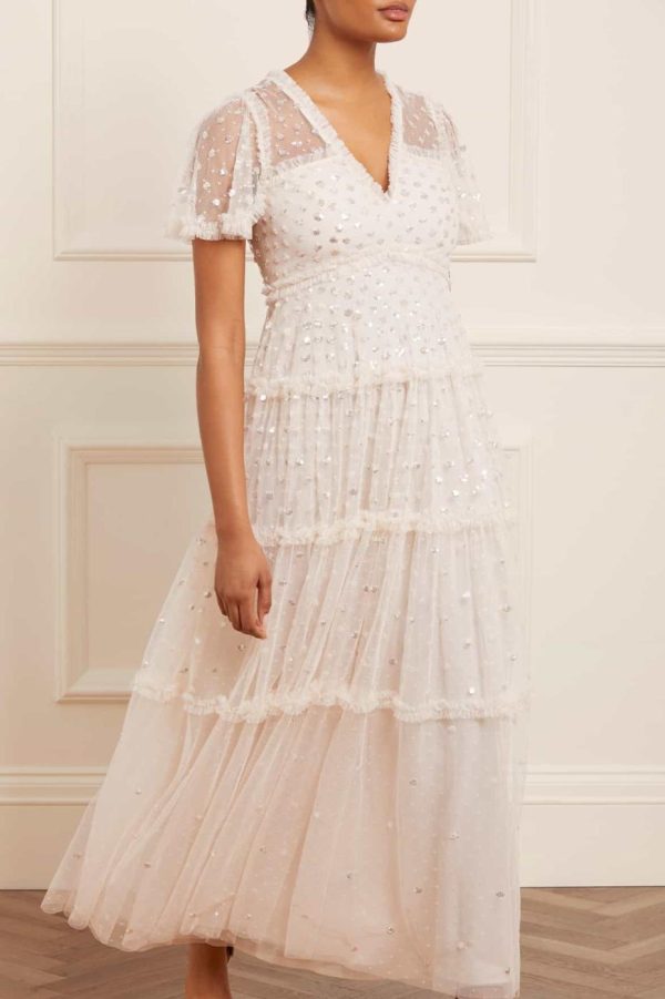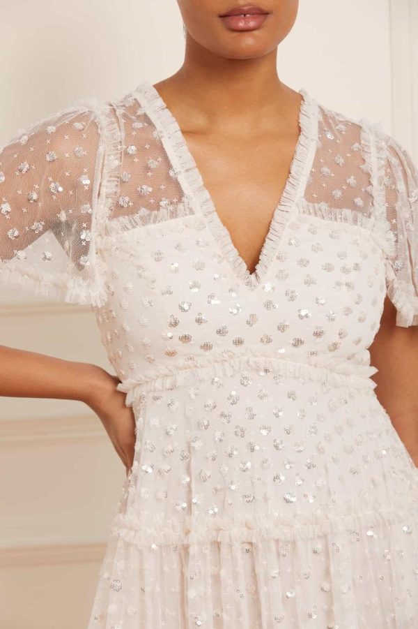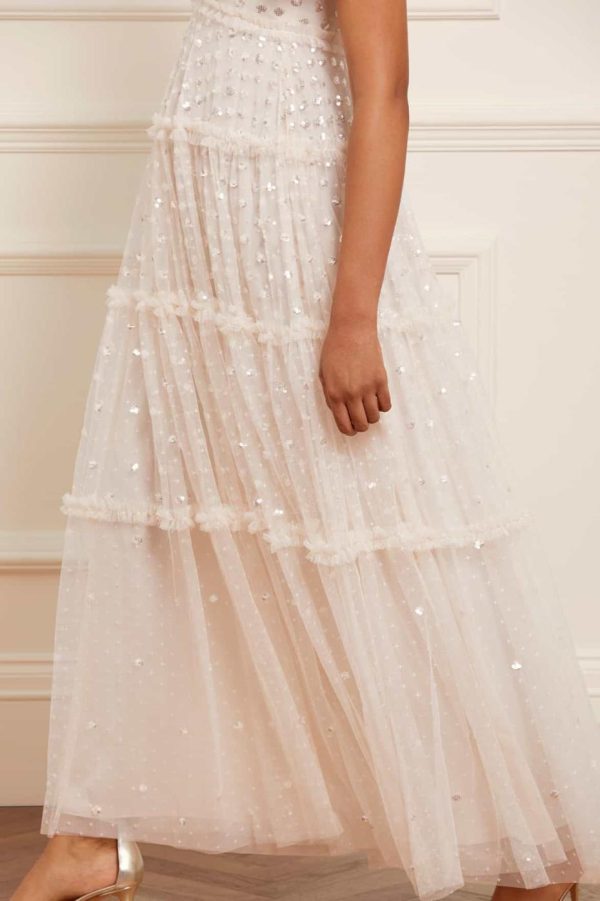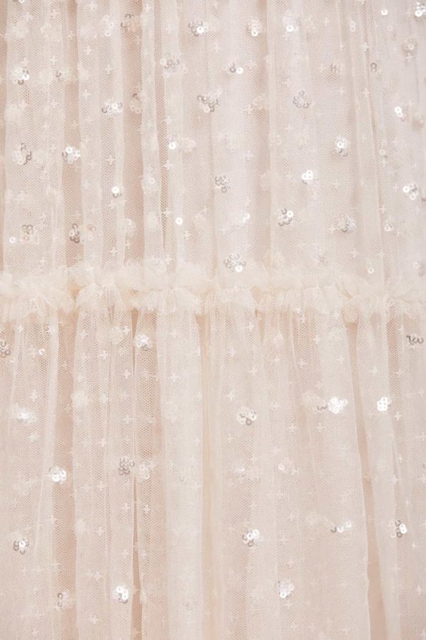 The Thea Gown in Cream. This gown is scattered with polka dot sequin motifs to create an enchanting shimmer throughout. Developed with signature Needle & Thread ‘x’ motif tulle adding subtle detail. Make a special appearance in the Thea at your next event.