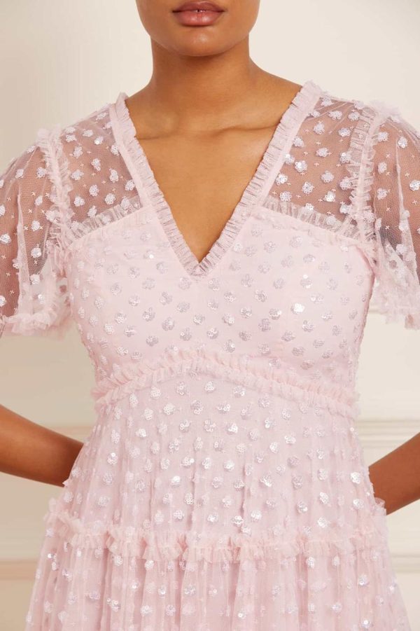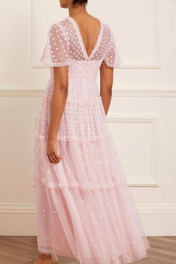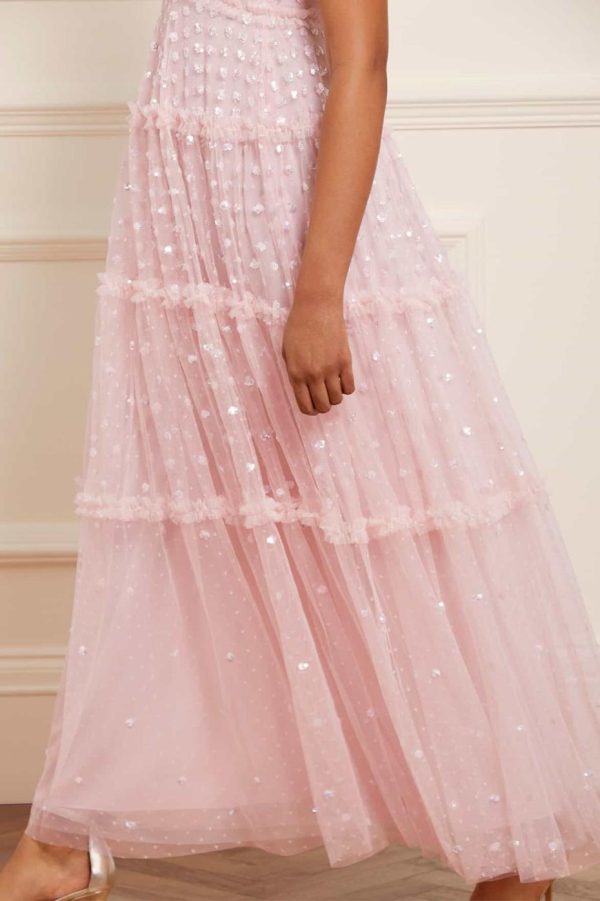 The Thea Gown in Dusk Pink. This gown is scattered with polka dot sequin motifs to create an enchanting shimmer throughout. Developed with signature Needle & Thread ‘x’ motif tulle adding subtle detail. Make a special appearance in the Thea at your next event.