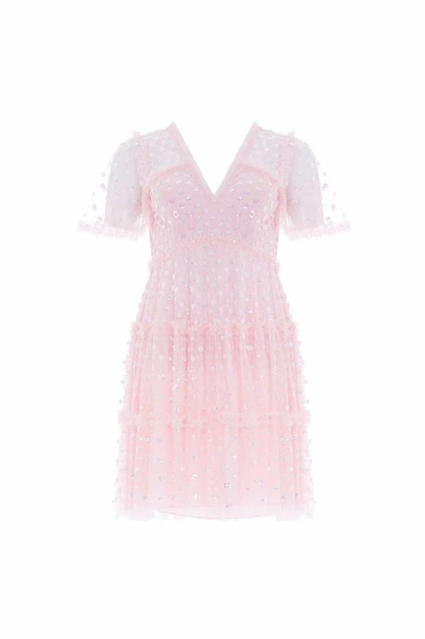 The Thea Mini Dress in Dusk Pink. This mini dress is scattered with polka dot sequin motifs to create an enchanting shimmer throughout. Developed with signature Needle & Thread ‘x’ motif tulle adding subtle detail. Make a special appearance in the Thea at your next event.