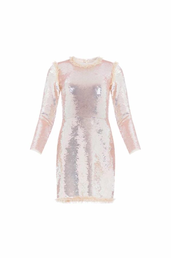 NEW SEASON. The Valerie Gloss Long Sleeve Micro Mini Dress in Beige / Gold. The statement dress of the season. This dress is decorated with high-shine gloss sequins creating a foil coating mirror effect. Developed with high powered mesh to create a figure-hugging silhouette that allows the dress to stretch and form around your body shape. Crafted with signature Needle & Thread frill details for the perfect finish. We hope you love the Valerie as much as we do.