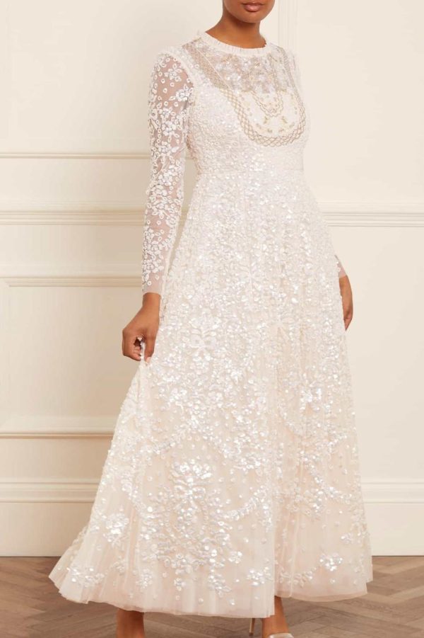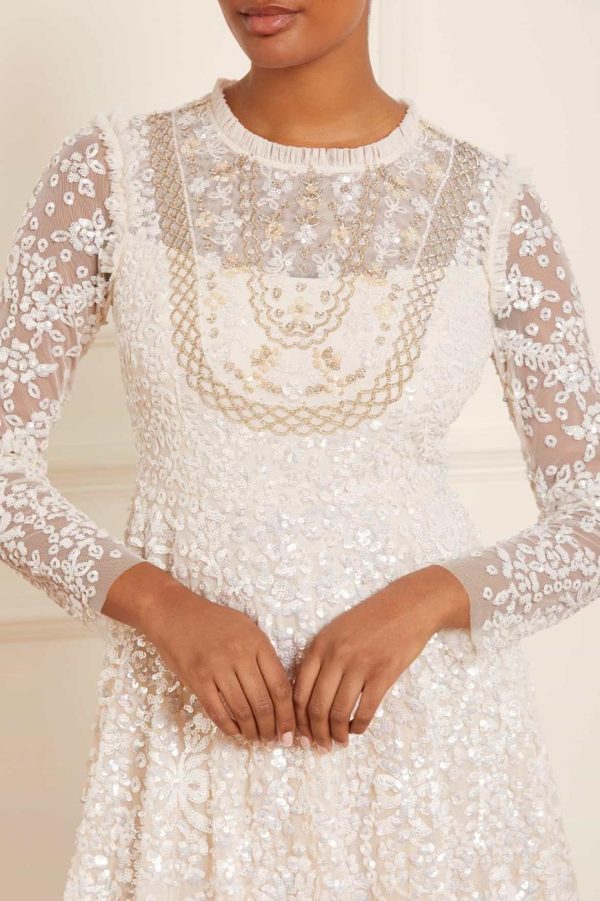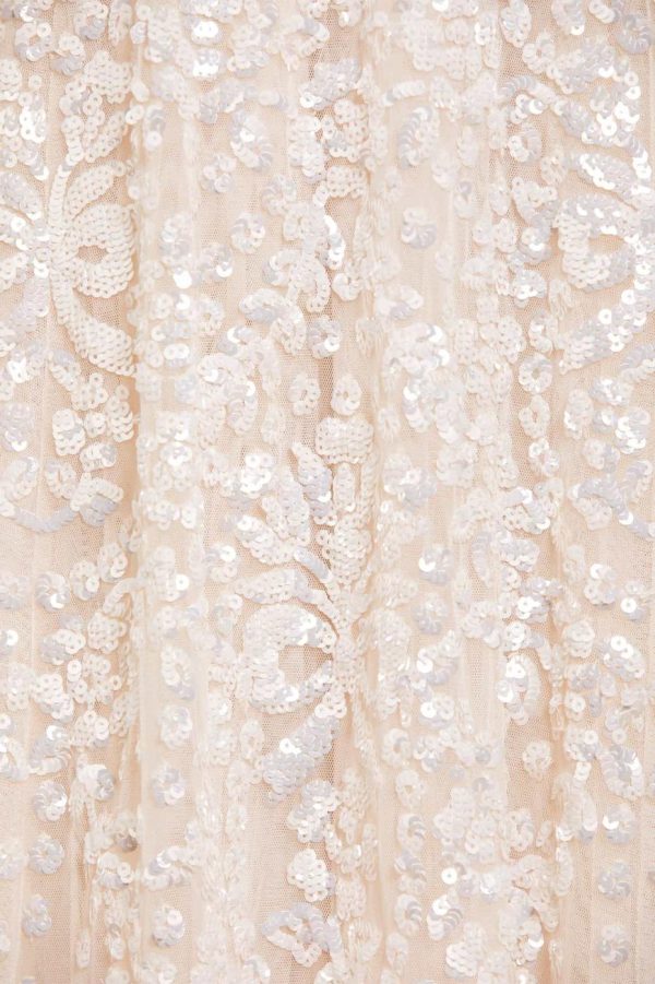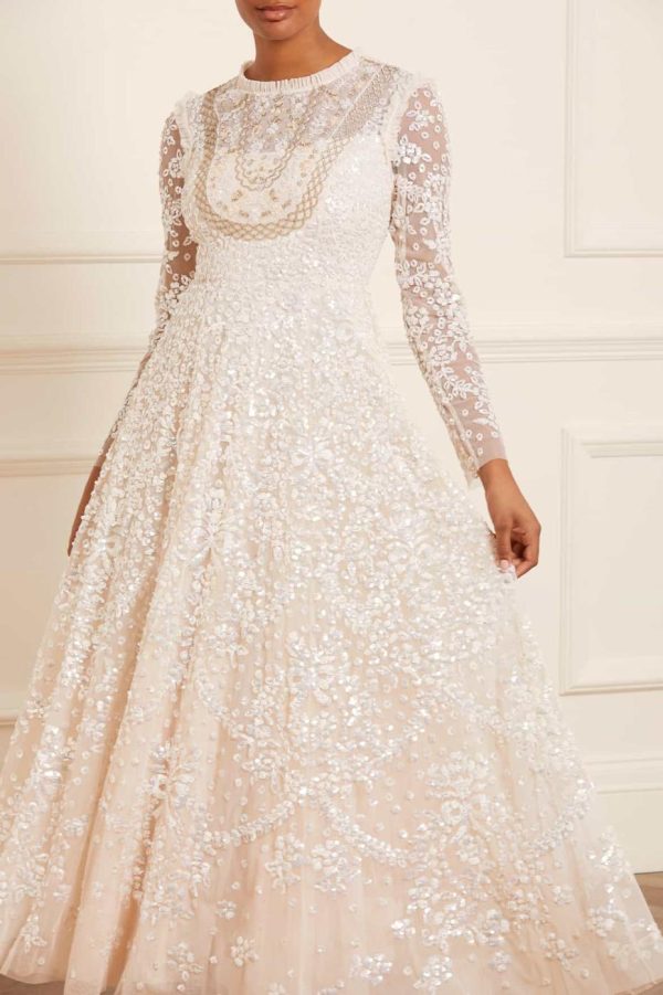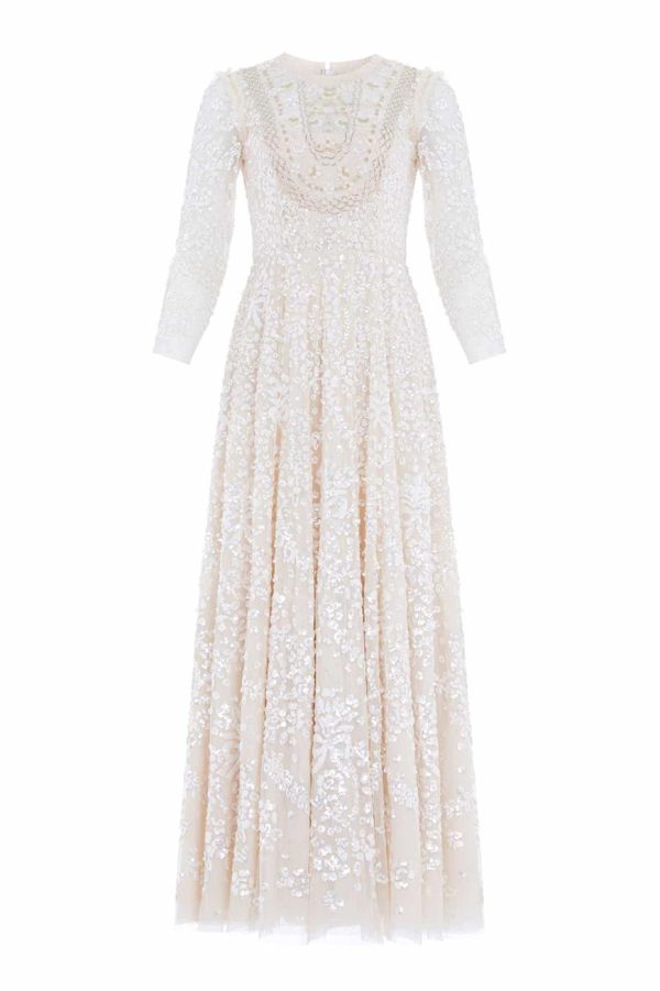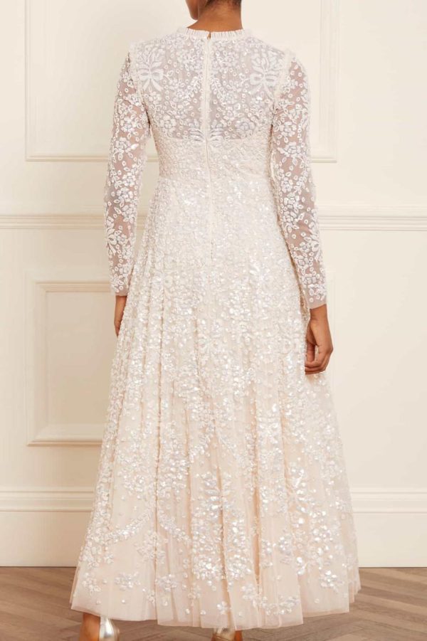 NEW SEASON. The Victorian Wreath Gloss Long Sleeve Gown in Cream. This gown takes inspiration from Victorian panelling details. Beautifully adorned with an intricate sequin artwork featuring floral and bow motifs in a repeated wreath layout. Needle & Thread have sourced special sequins with extra foil coating to create an ultra high shine look. This gown is perfect for an upcoming special day.