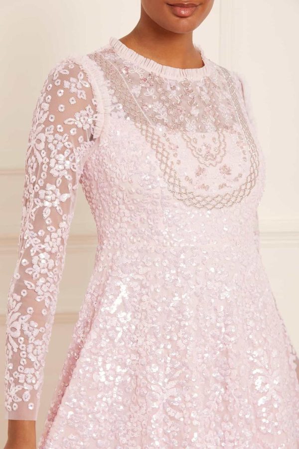 NEW SEASON. The Victorian Wreath Gloss Long Sleeve Gown in Peony Pink. This gown takes inspiration from Victorian panelling details. Beautifully adorned with an intricate sequin artwork featuring floral and bow motifs in a repeated wreath layout. Needle & Thread have sourced special sequins with extra foil coating to create an ultra high shine look. This gown is perfect for an upcoming special day.