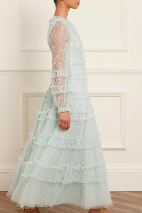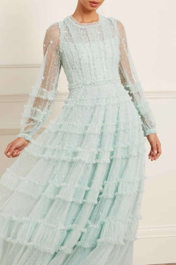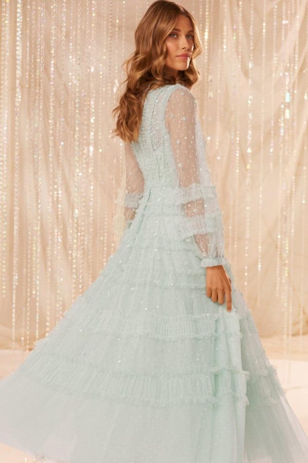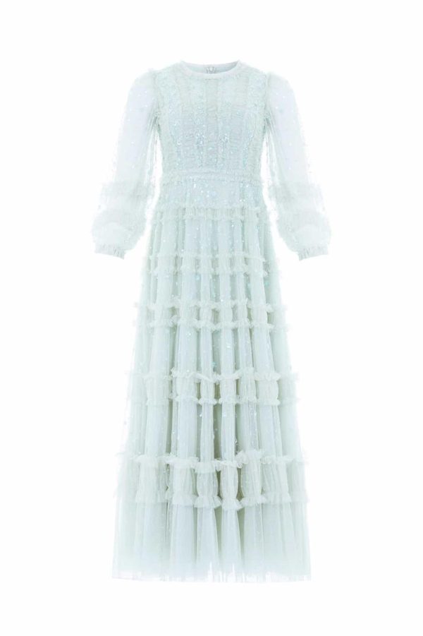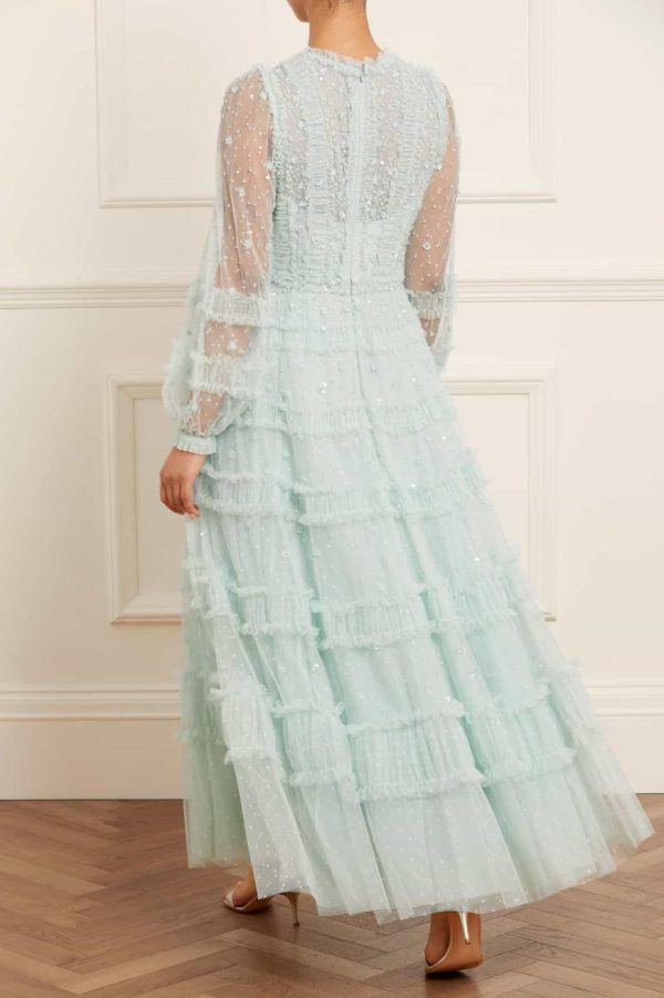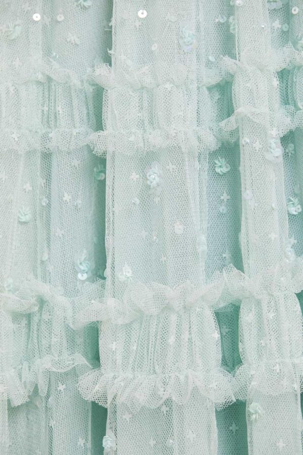The Violet Shimmer Ankle Gown in Spring Mint. This romantic style is delicately scattered with a shimmering sequin artwork. The silhouette is beautifully adorned with double stitch ruffles for added texture. Developed from pretty, kisses tulle for signature Needle & Thread detailing. Shine under the spotlight in the Violet Shimmer.