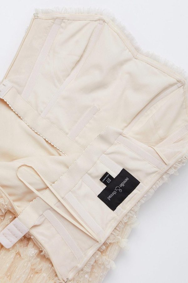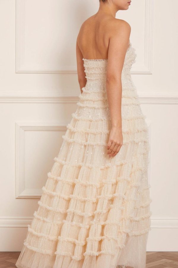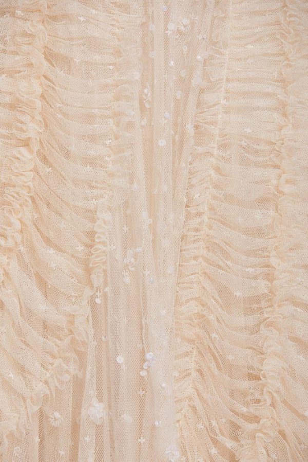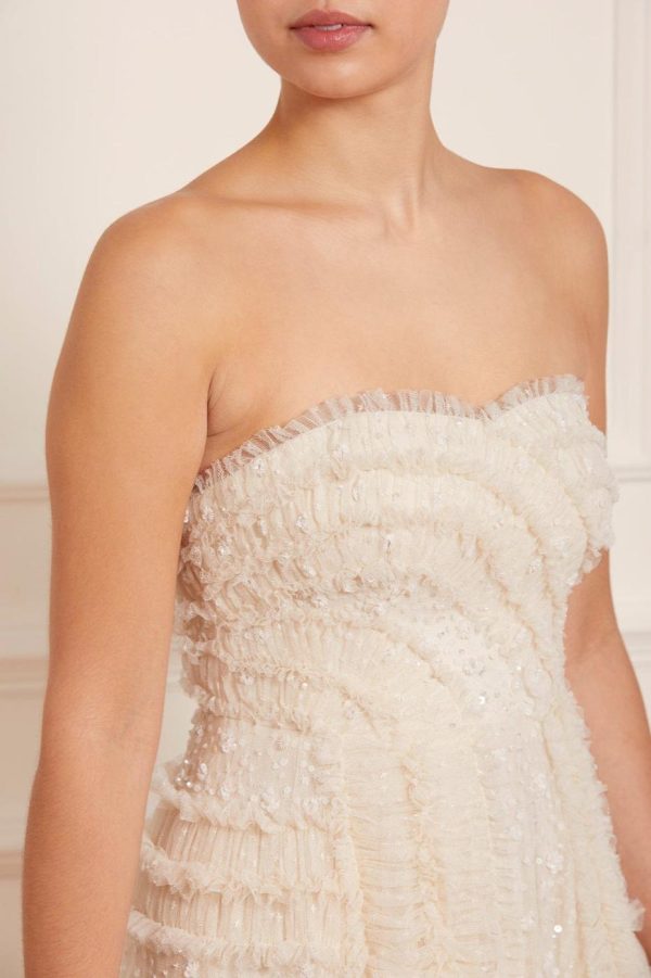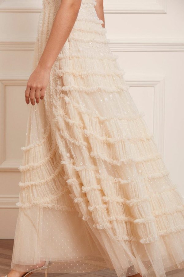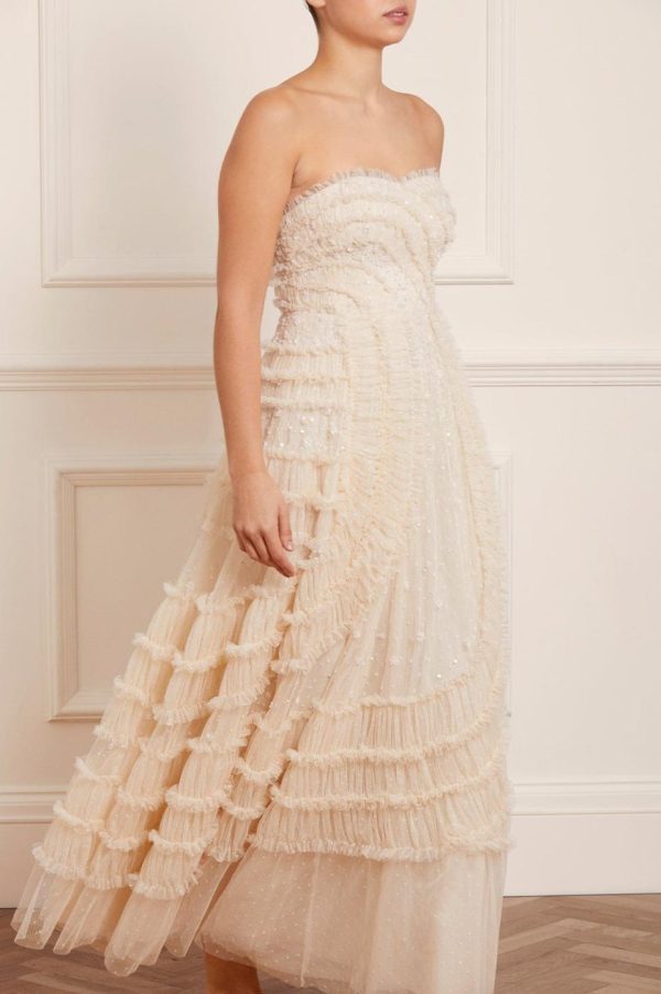 NEEDLE & THREAD EXCLUSIVE. The Violet Shimmer Strapless Corset Ballerina Dress in Champagne. This romantic dress is delicately scattered with a shimmering sequin artwork. The silhouette is beautifully adorned with double stitch ruffles creating a dramatic, sweeping statement. Designed with an integrated corset made with ribbon stitching, soft boning and panels of stretch mesh fabric for comfort and security in the fit. Developed from pretty, kisses tulle for signature Needle & Thread detailing. Shine under the spotlight in the Violet Shimmer.