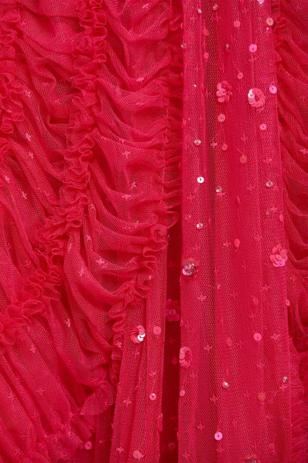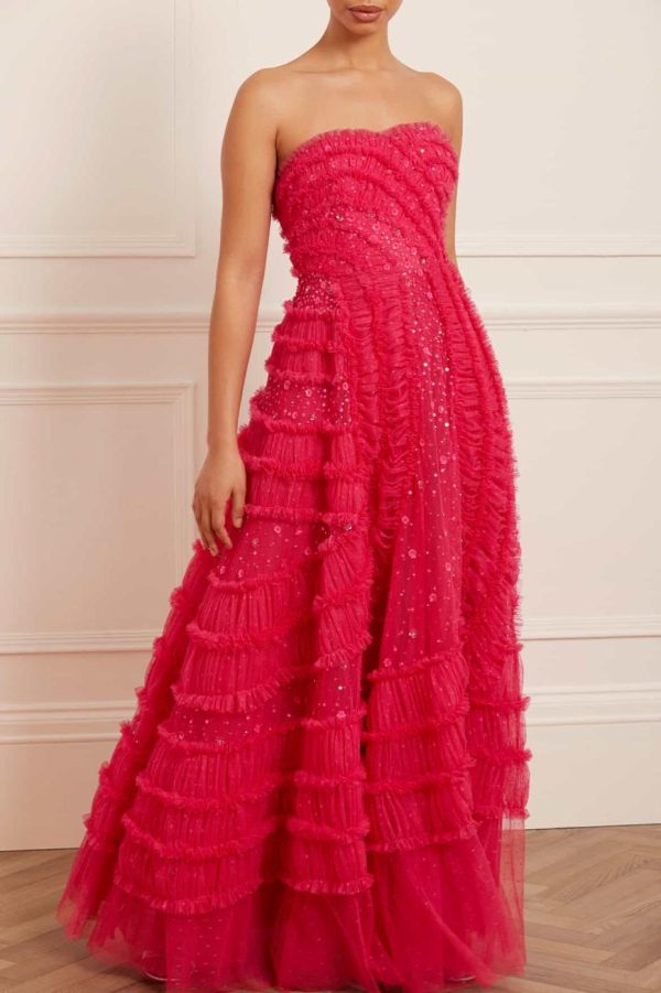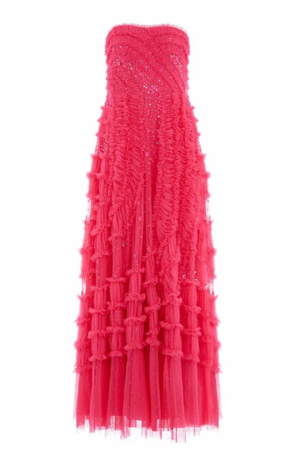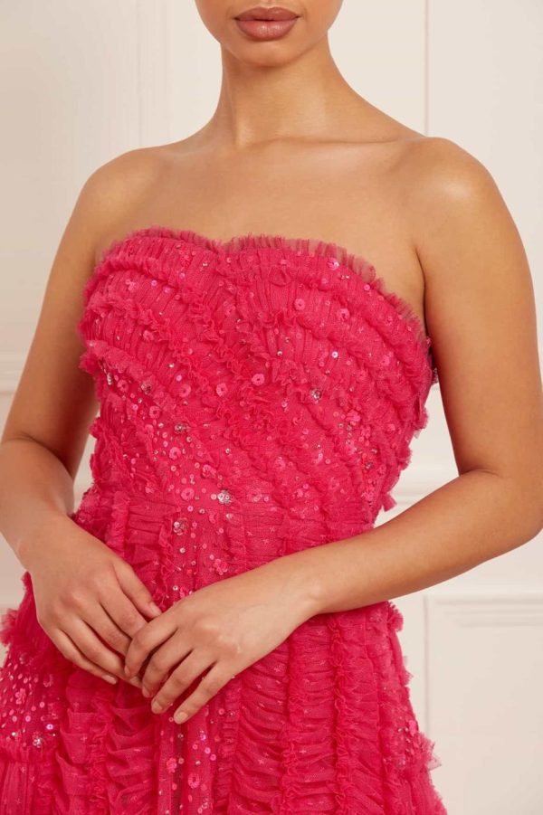 The Violet Shimmer Strapless Gown in Azalea Pink. This romantic gown is delicately scattered with a shimmering sequin artwork. The silhouette is beautifully adorned with double stitch ruffles creating a dramatic, sweeping statement. Designed with an integrated corset made with ribbon stitching, soft boning and panels of stretch mesh fabric for comfort and security in the fit. Developed from pretty, kisses tulle for signature Needle & Thread detailing. Shine under the spotlight in the Violet Shimmer.