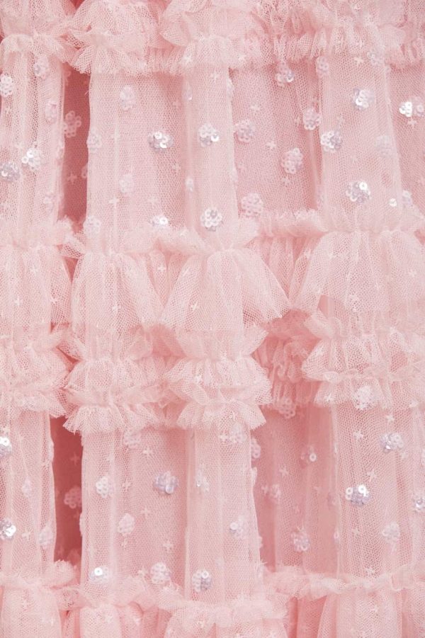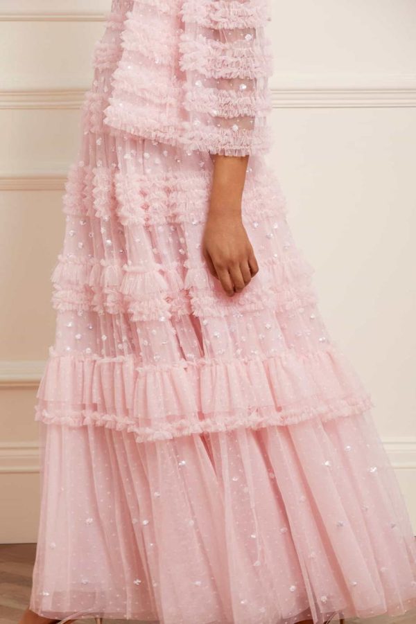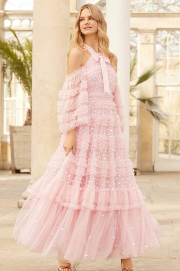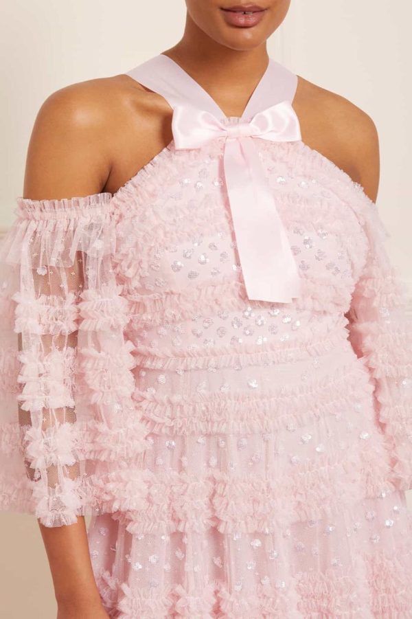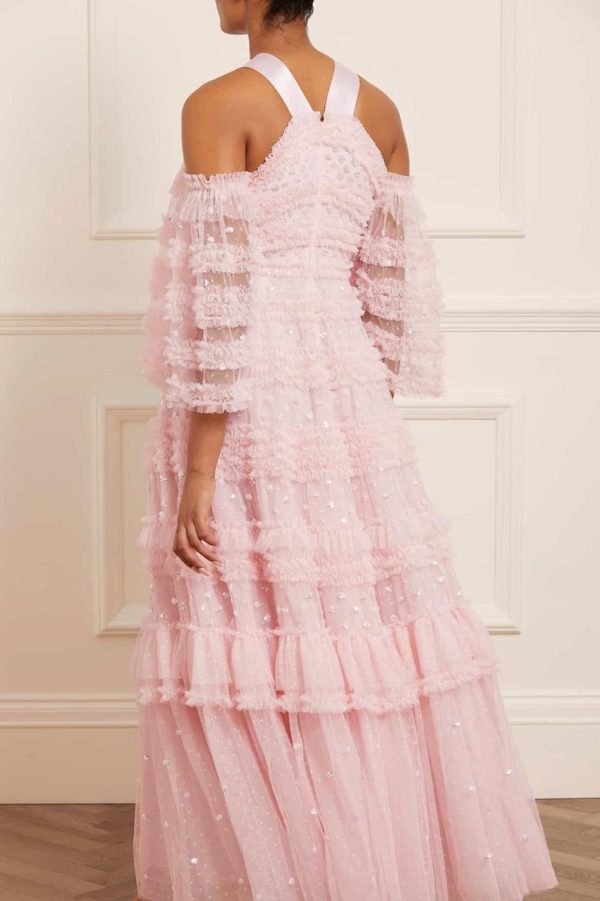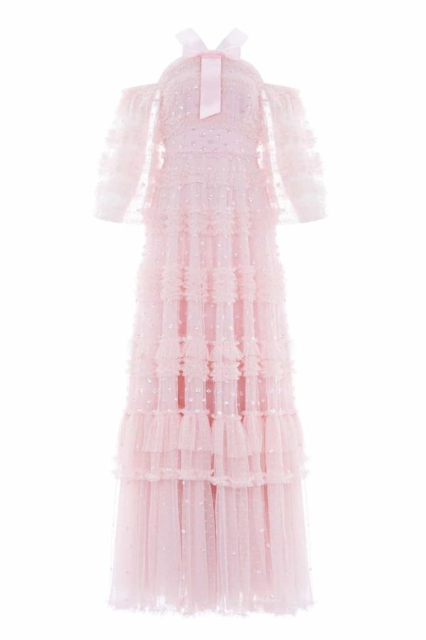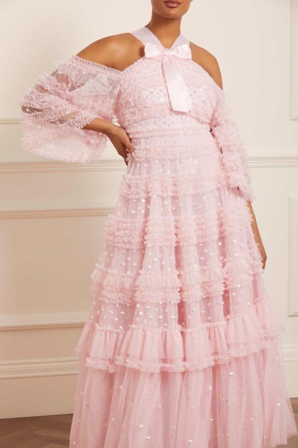The Vivian Off Shoulder Gown in Dusk Pink. A signature Needle & Thread style statement. Beautifully printed with sequin polka dot motifs scattered throughout, creating an enchanting shimmer. Adorned with specially sourced sequins to create a sparkling effect throughout. This romantic style features tulle frills in perfectly positioned rows, creating a soft, frothy texture. Developed with generous ruffled sleeves, cut-out shoulders and a satin bow at the neck for a contemporary look. A stylish piece you’ll wear time and time again.