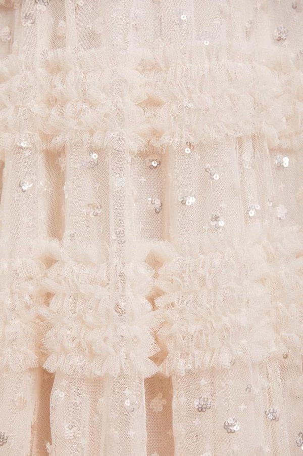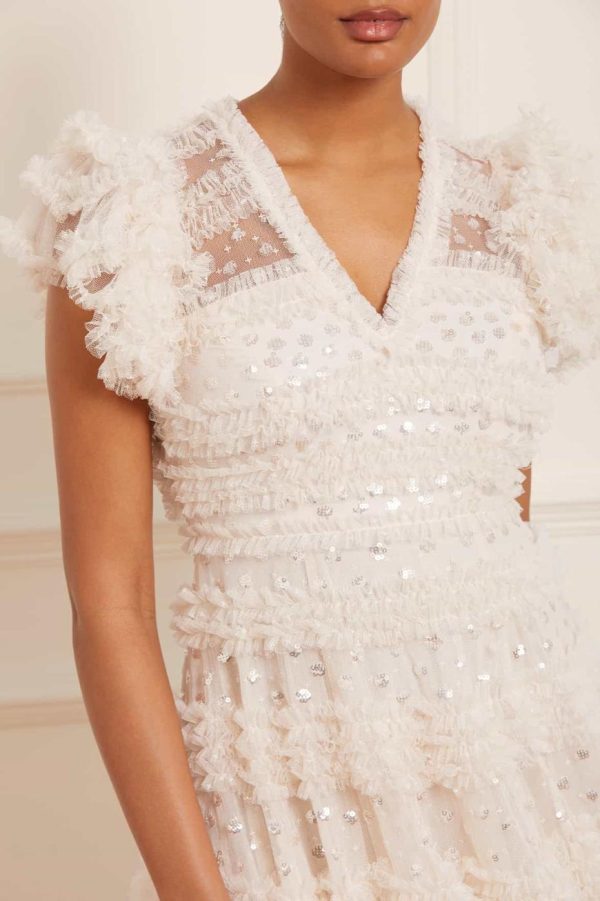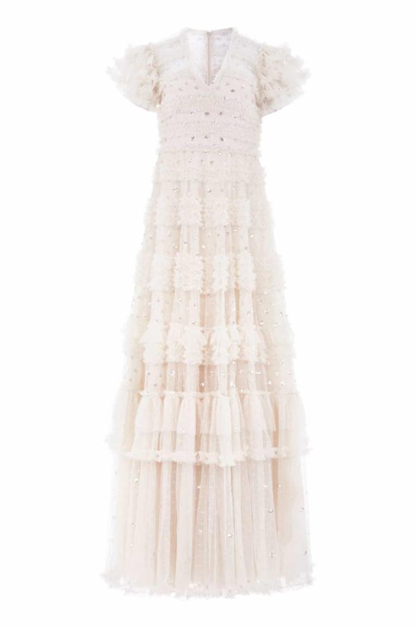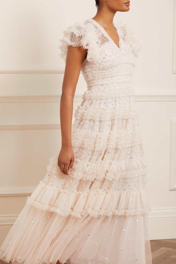 The Vivian V-Neck Gown in Cream. A signature Needle & Thread style statement. Beautifully printed with sequin polka dot motifs scattered throughout, creating an enchanting shimmer. Adorned with specially sourced sequins to create a sparkling effect throughout. This romantic style features tulle frills in perfectly positioned rows, creating a soft, frothy texture. Developed with generous ruffled sleeves and a V-neckline for a contemporary look. A style you’ll wear time and time again.