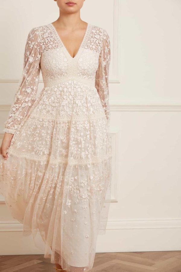 The Celestia Ribbon Gown in Champagne. This gown has been intricately designed with rich embroidery inspired by vintage lace, featuring delicate floral motifs and ribbon bows throughout. Crafted with pretty lace trims for signature Needle & Thread detailing, and delicately constructed with a textured tulle fabric base. Featuring a V-shaped neckline and a new, ultra-flattering silhouette. Make the ultimate statement in the Celestia.