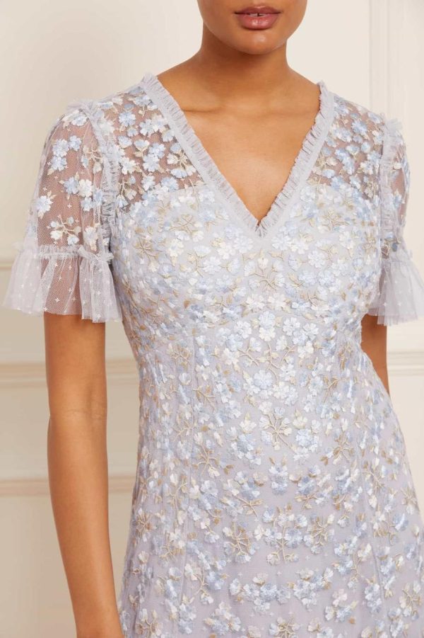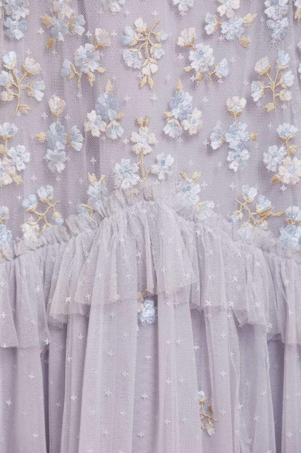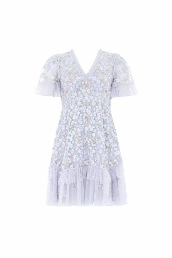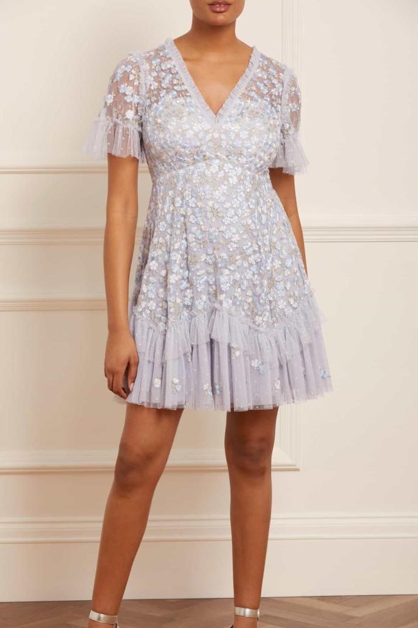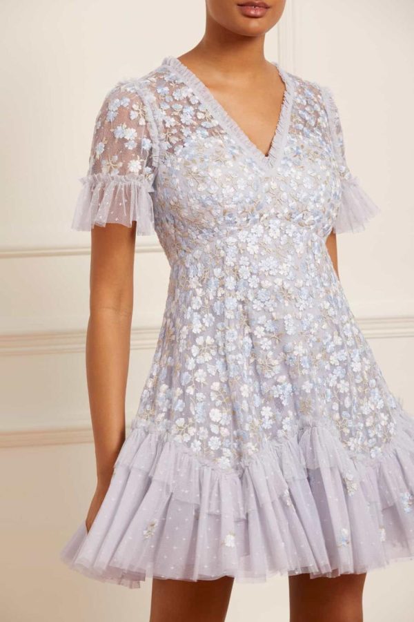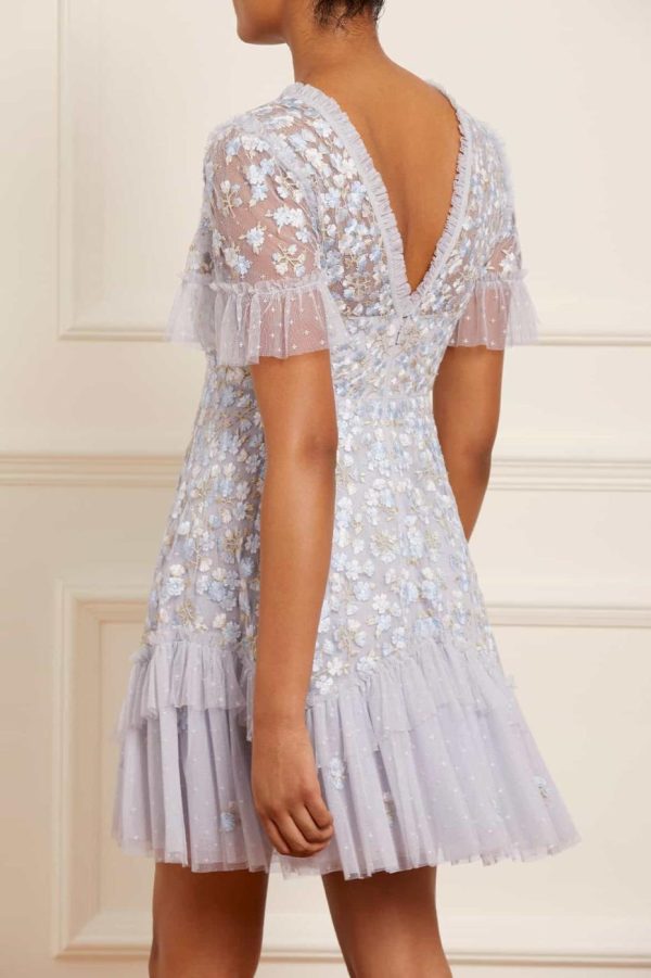 The Evening Primrose Micro Mini Dress in Cornflower Blue. This mini dress is designed beautifully with scattered all-over floral embroidery in pastel tones. The silhouette has been inspired by a 1930’s tea dress, featuring an effortless shape skirt with a layered, tiered hem for extra movement. A perfect piece for a special occasion.