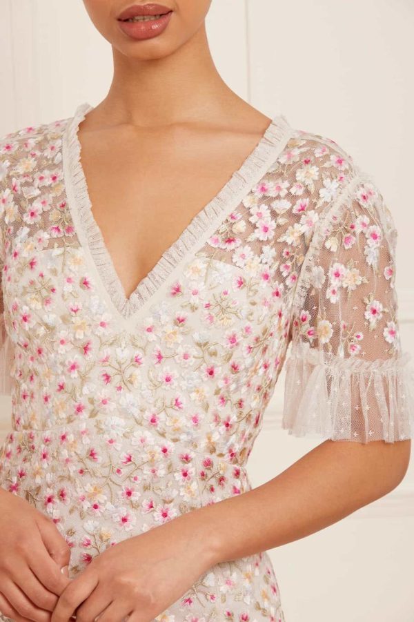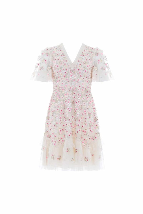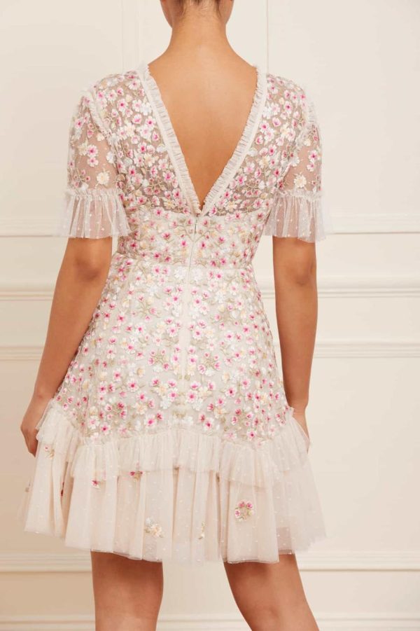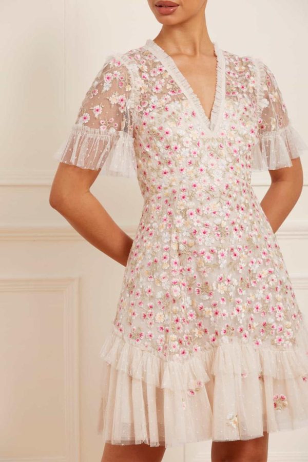 The Evening Primrose Micro Mini Dress in Cream / Azalea Pink. This mini dress is delicately scattered with all-over floral embroidery. Beautifully developed with bright pink, blue and yellow tones for an enchanting colour palette – inspired by a hummingbird. The silhouette of the dress is inspired by a 1930’s tea dress, featuring an effortless shape skirt with a layered, tiered hem for extra movement. A versatile piece for any occasion.