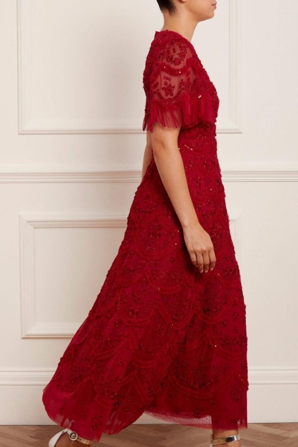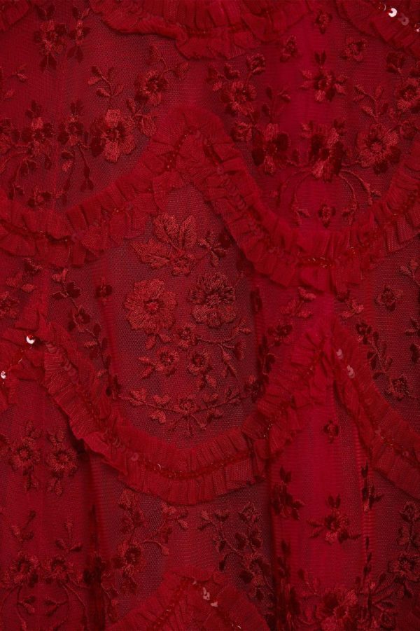 The Lily Bloom Ankle Gown in Deep Red. This ankle gown is beautifully designed with delicate tulle ruffles and soft scallop shaping for signature Needle & Thread styling. Adorned with intricate red floral embroidery and trimmed with a high shine sequin adding shimmer throughout. Make the Lily your new wardrobe addition.