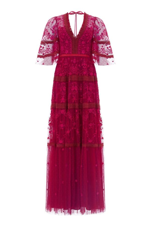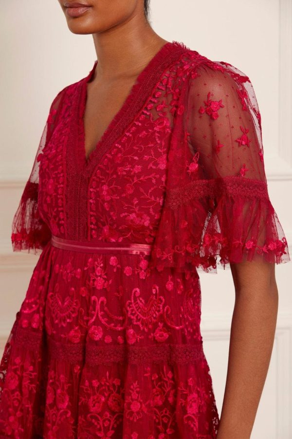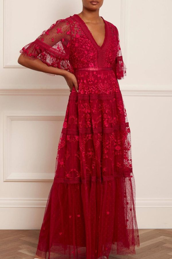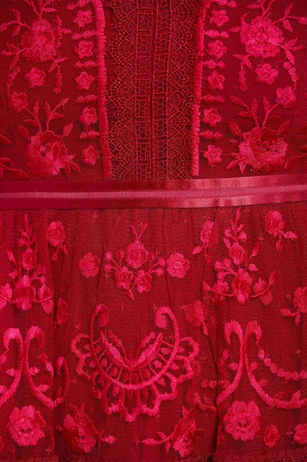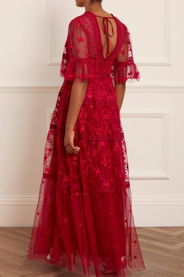 The Lottie Lace Gown in Deep Red. A signature Needle & Thread style, updated for the new season ahead. Taking inspiration from Victorian lace, the Lottie features intricately embroidered artwork in a romantic red on delicate tulle. Lace trims border the neckline and frame each tier of the skirt. This embroidered lace gown has sheer, romantic sleeves and our signature grosgrain ribbon at the waist. The perfect gown to take you from day to night.