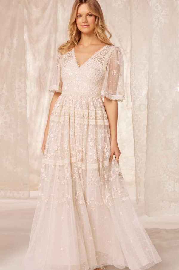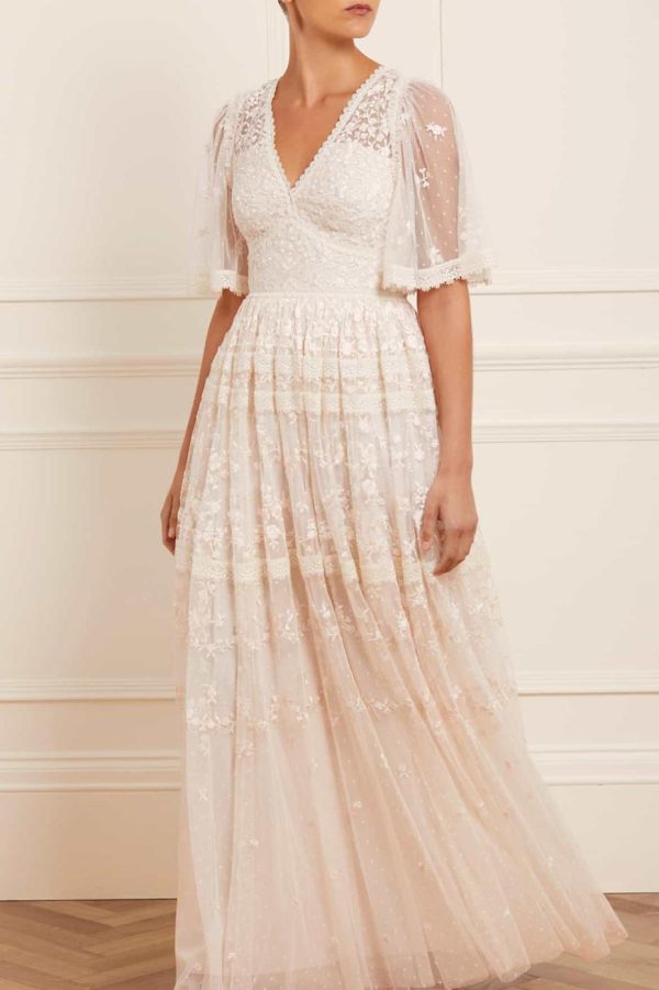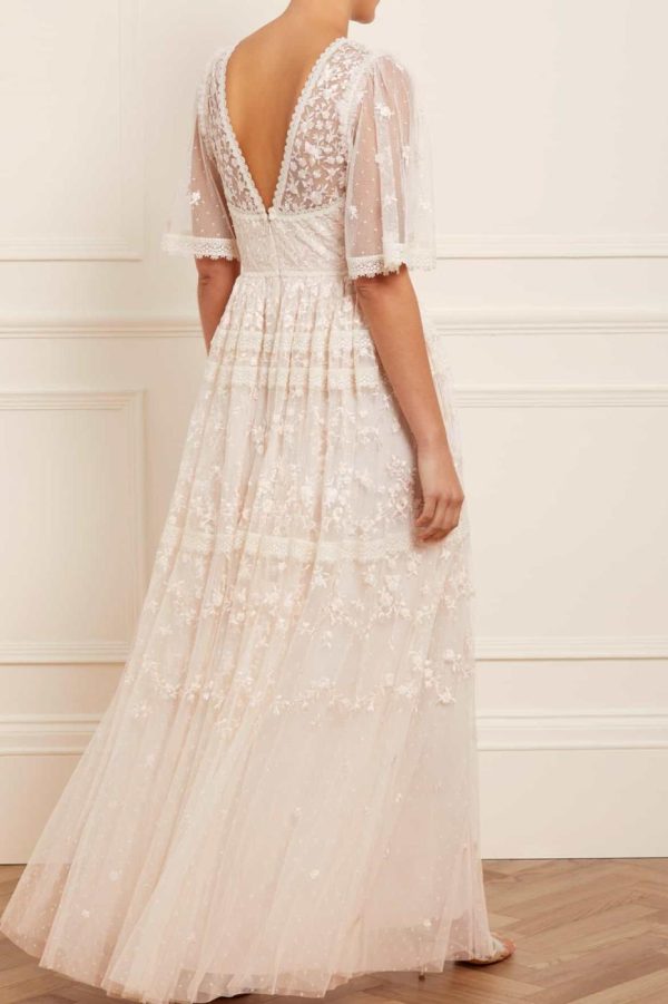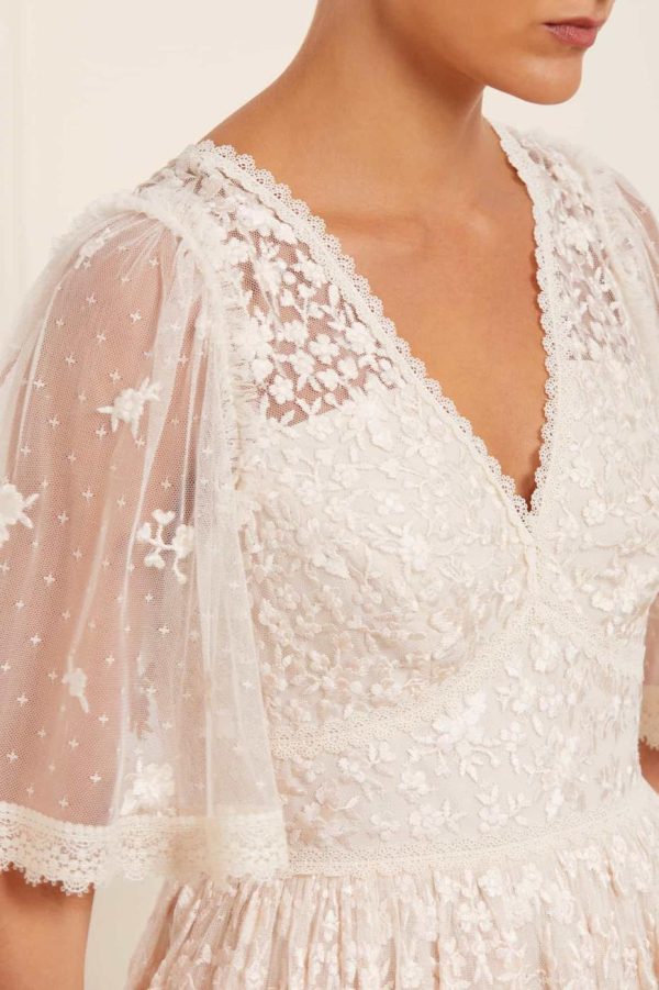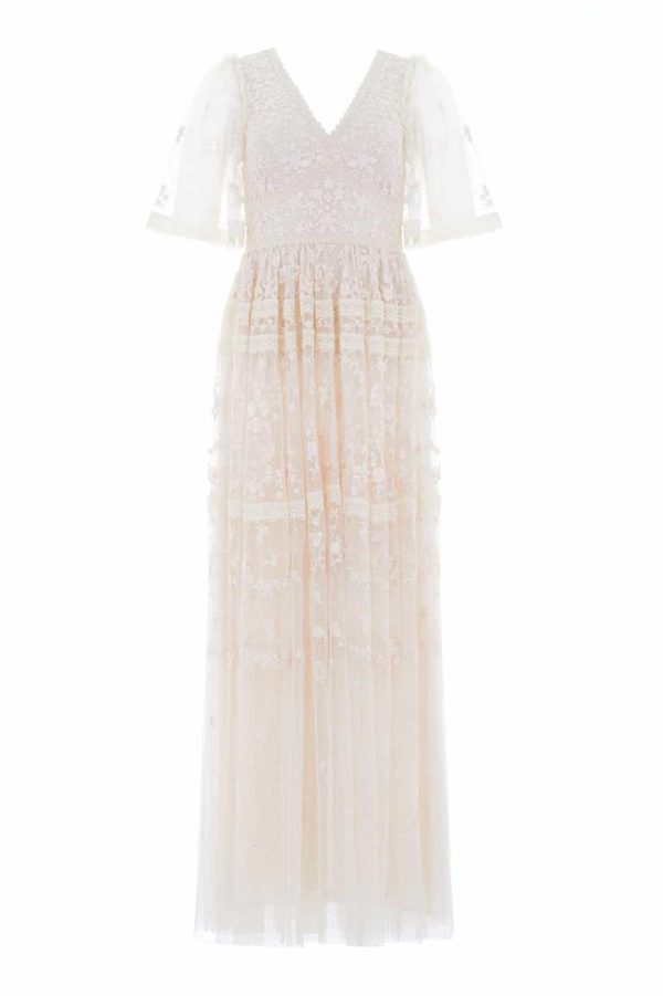 The Sweetheart Lace Gown in Cream. A signature Needle & Thread style, delicately embroidered with a floral lace artwork. Designed with intricate trimmed lace in pretty border motifs and perfectly positioned tiers through the skirt. Crafted from soft, kisses tulle creating a romantic texture throughout. The perfect gown to take you from day to night.