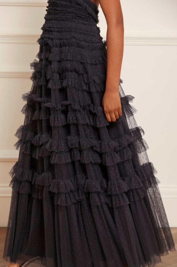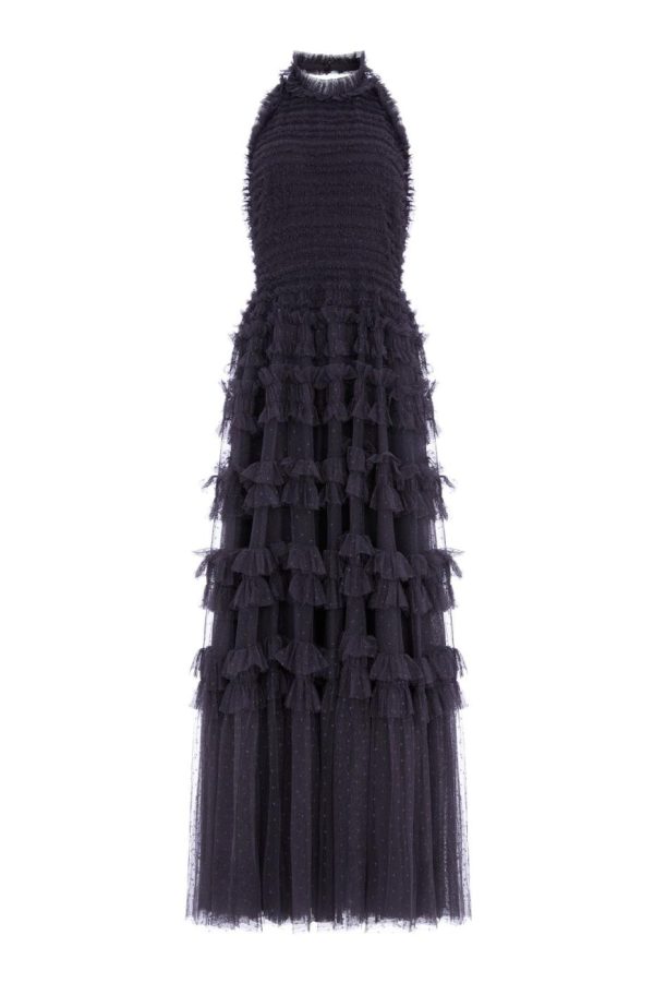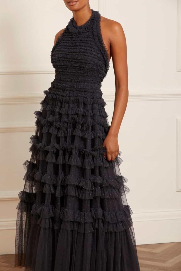 NEW SEASON. The Lisette Ruffle Halter Neck Gown in Graphite. A brand new shape for the season ahead. Crafted with an elegant halter neck and backless design. Beautifully engineered with signature Needle & Thread textile, delicate tulle panels and perfectly placed frills. Designed with a generous sweeping hemline made from layers of tulle and net to create a romantic silhouette. Make an entrance in this show-stopping style.