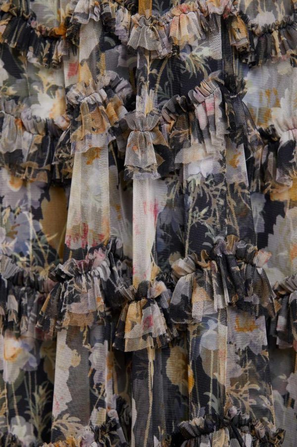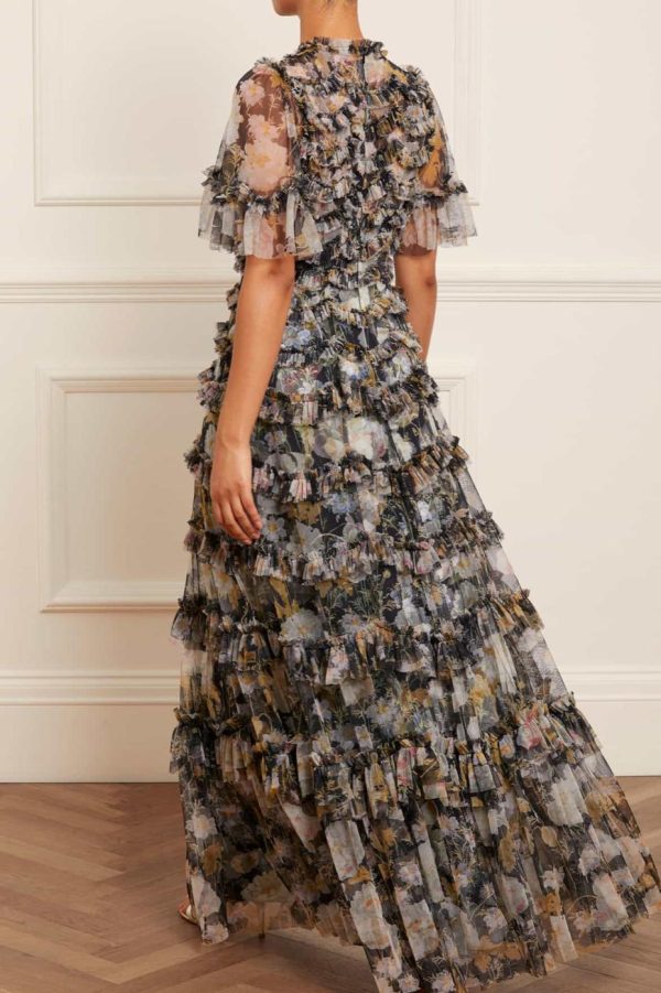 NEW SEASON. The Moonlight Petals Round Neck Gown in Graphite. The print of this gown is taken from a 1900’s hand-painted artwork. Beautifully printed with soft white peonies and silvery blue wildflowers creating an enchanting print. Crafted with signature Needle & Thread detailing featuring delicate tulle frills, scallop shape borders and frills creating romantic texture throughout. You can dress the Moonlight up or down depending on the occasion.