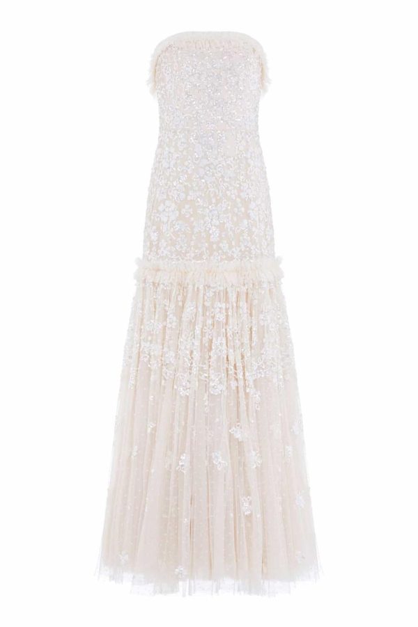 NEW SEASON. The Regal Rose Gloss Strapless Gown in Cream. The Regal Rose is decorated with elegant, floral artwork featuring delicate lace. This gown is developed with a fitted corset bodice and then flows into a dramatic, voluminous skirt. The integrated corset is made with ribbon stitching, soft boning and panels of stretch mesh fabric for comfort and security in the fit. The perfect gown for a special moment.