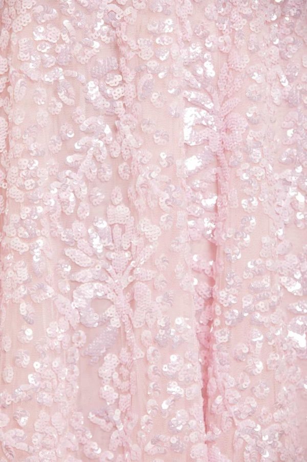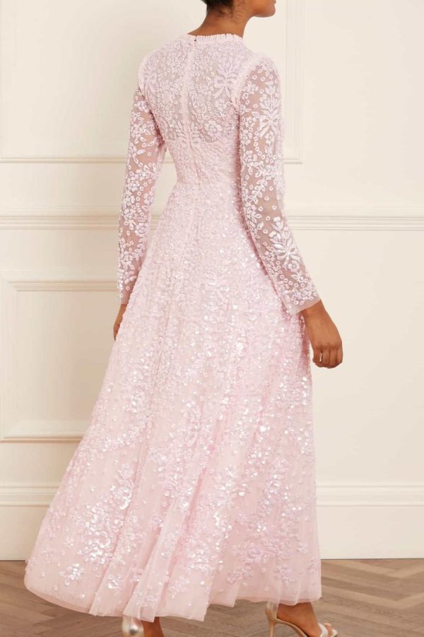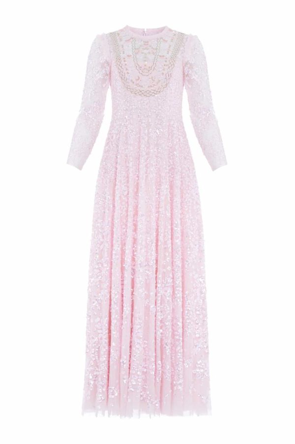 NEW SEASON. The Victorian Wreath Gloss Long Sleeve Gown in Peony Pink. This gown takes inspiration from Victorian panelling details. Beautifully adorned with an intricate sequin artwork featuring floral and bow motifs in a repeated wreath layout. Needle & Thread have sourced special sequins with extra foil coating to create an ultra high shine look. This gown is perfect for an upcoming special day.