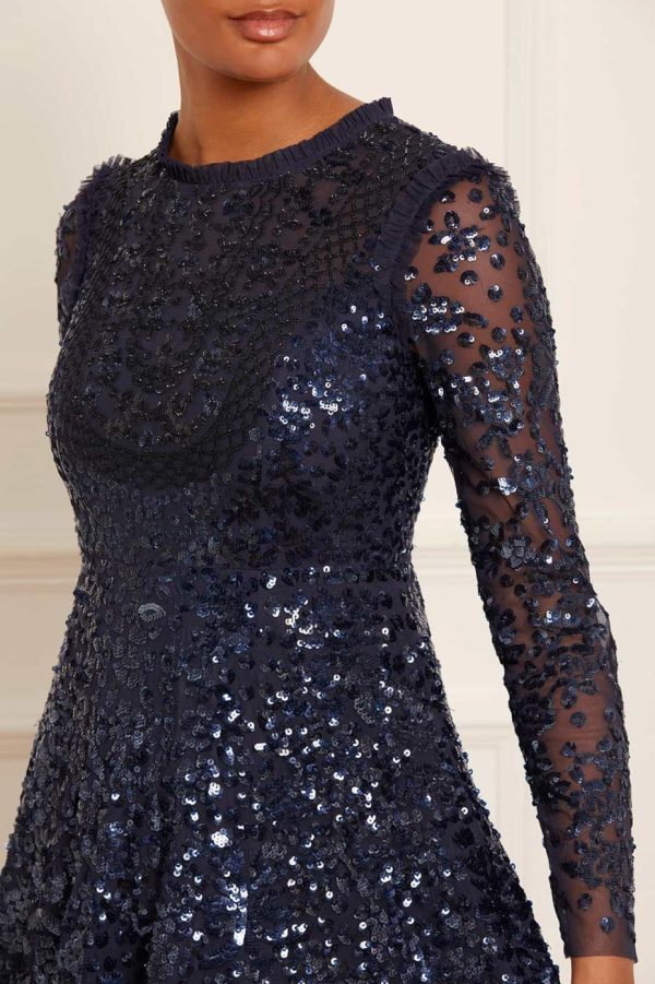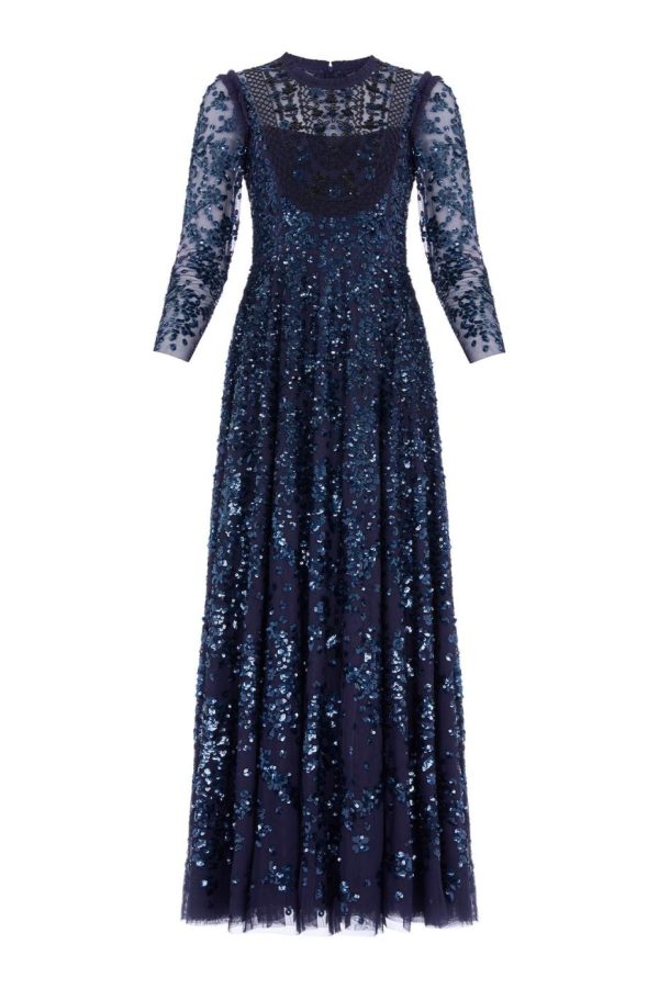 NEW SEASON. The Victorian Wreath Gloss Long Sleeve Gown in Navy. This gown takes inspiration from Victorian panelling details. Beautifully adorned with an intricate sequin artwork featuring floral and bow motifs in a repeated wreath layout. Needle & Thread have sourced special sequins with extra foil coating to create an ultra high shine look. This gown is perfect for an upcoming special day.