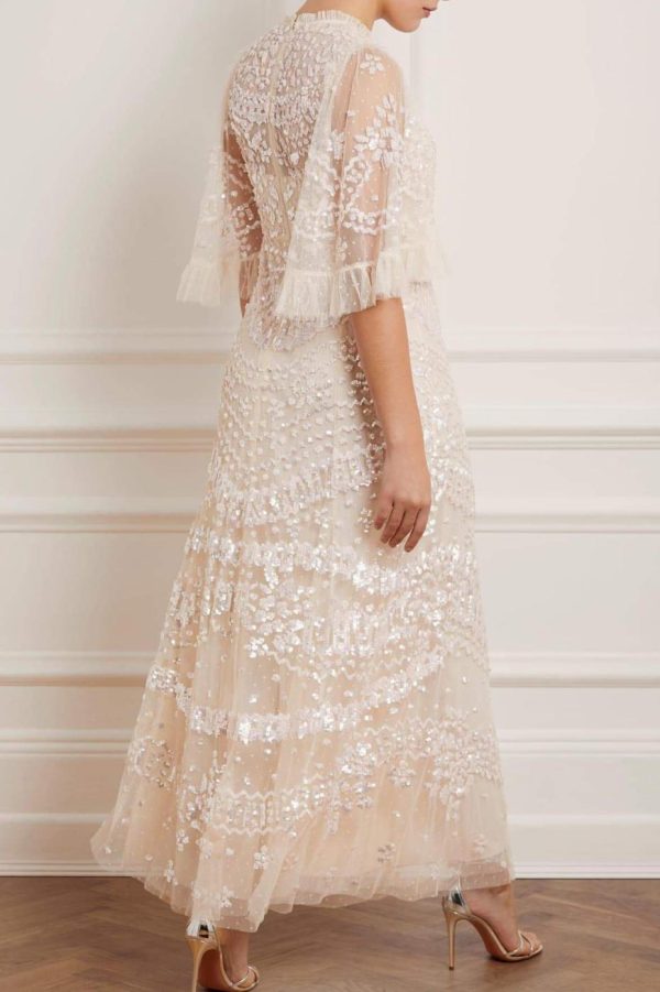 NEEDLE & THREAD EXCLUSIVE | The Anais Sequin Gown in Champagne / Pink. This gown is beautifully decorated in sequins, developed from a vintage, French hand-drawn lace design. Crafted with lace floral borders throughout, and floaty sleeves. The perfect dress for any occasion.