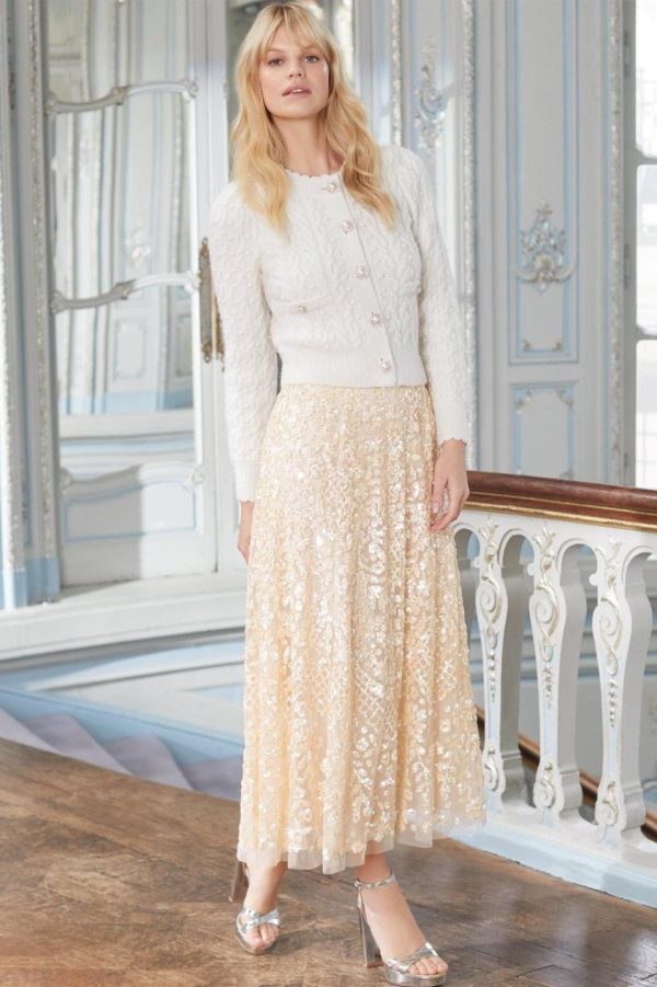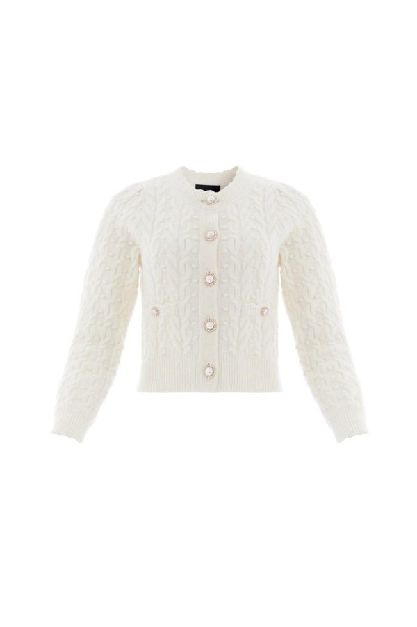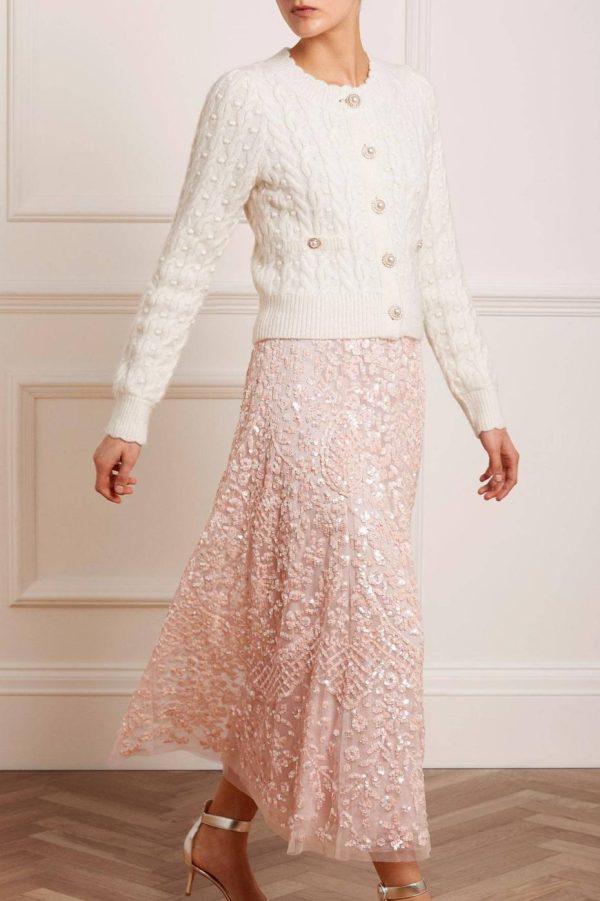 NEEDLE & THREAD EXCLUSIVE. The Cable Bobble Short Cardigan in Champagne. This cardigan is crafted from soft alpaca yarn, resulting in a cosy, fluffy texture. Featuring intricate cables and bobbles to create a substantial, deeply tactile knit. Designed with faux pockets, crystal buttons and scallop detailing. Make this style a new wardrobe favourite.