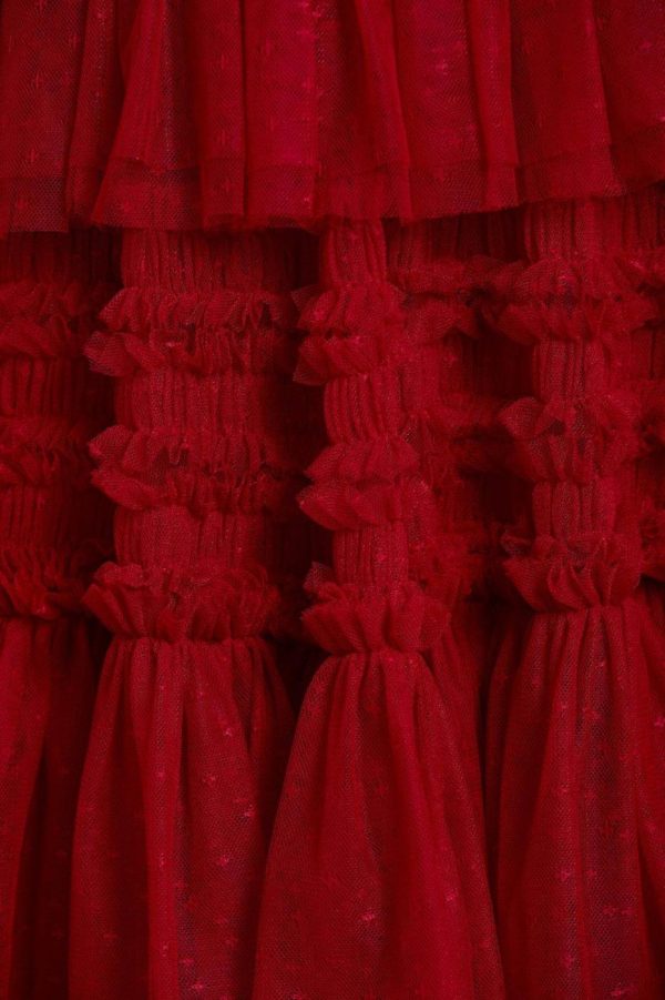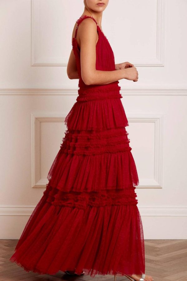 NEEDLE & THREAD EXCLUSIVE. The Candice Gown in Deep Red. This gown features whimsical ruffles and layered frills to create a flattering, statement look. Designed with a soft, layered tulle net for a romantic silhouette as you walk. Make the ultimate statement in this show-stopping gown.