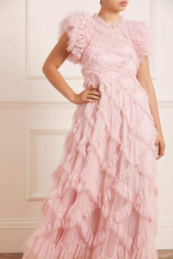 NEEDLE & THREAD EXCLUSIVE. The Genevieve Rose Gown in Ballerina Pink. This statement gown is inspired by 1930s Hollywood glamour. Beautifully designed with diamond tulle details and trims. Crafted with multiple layers of ruffled, frothy tulle sculpted for dramatic effect. Make the ultimate style statement this season.