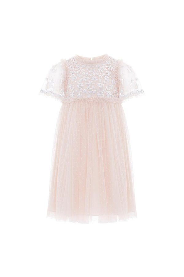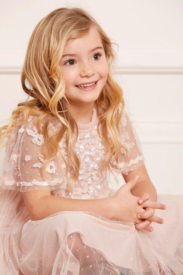 NEW SEASON | NEEDLE & THREAD EXCLUSIVE. The Lilybelle KIDS Dress in Strawberry Icing. This dress is beautifully embellished with tonal sequins scattered across the bodice. Intricately designed with tulle trims around the neck and waistline. Featuring a multi-layered frothy tulle skirt, adding a pretty, playful texture. Dress her up in the Lilybelle for any occasion.