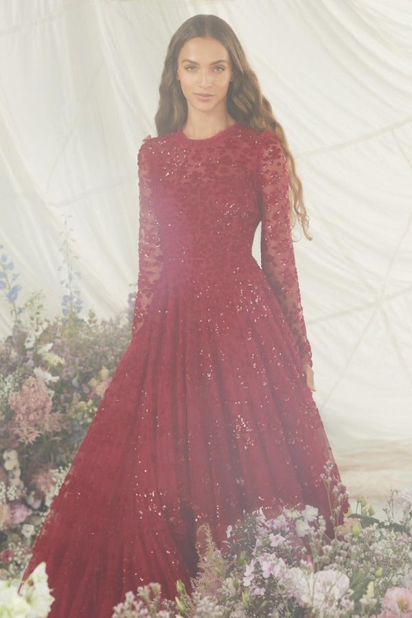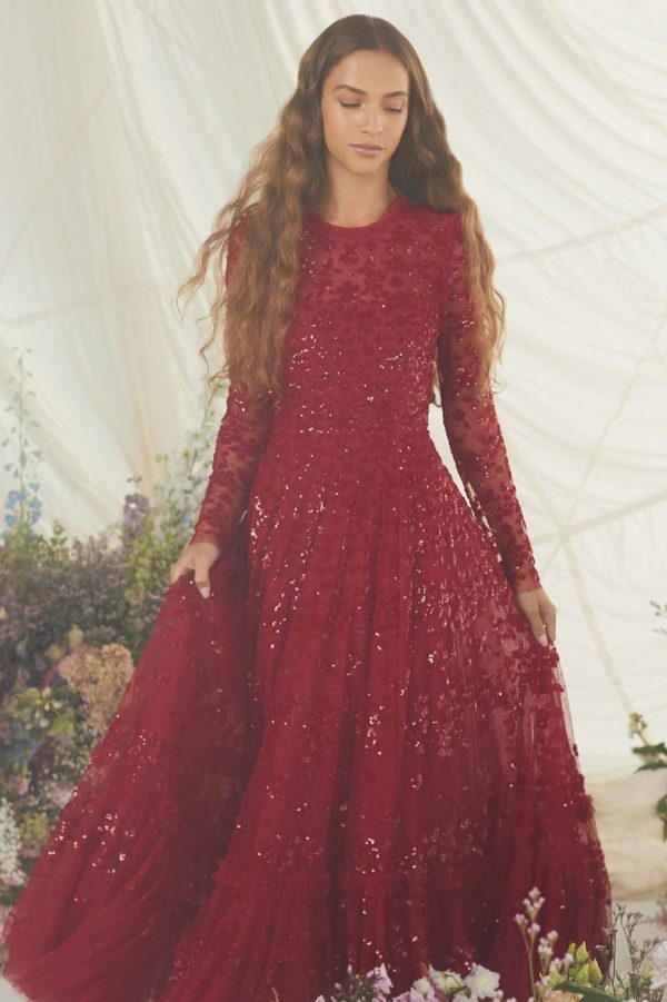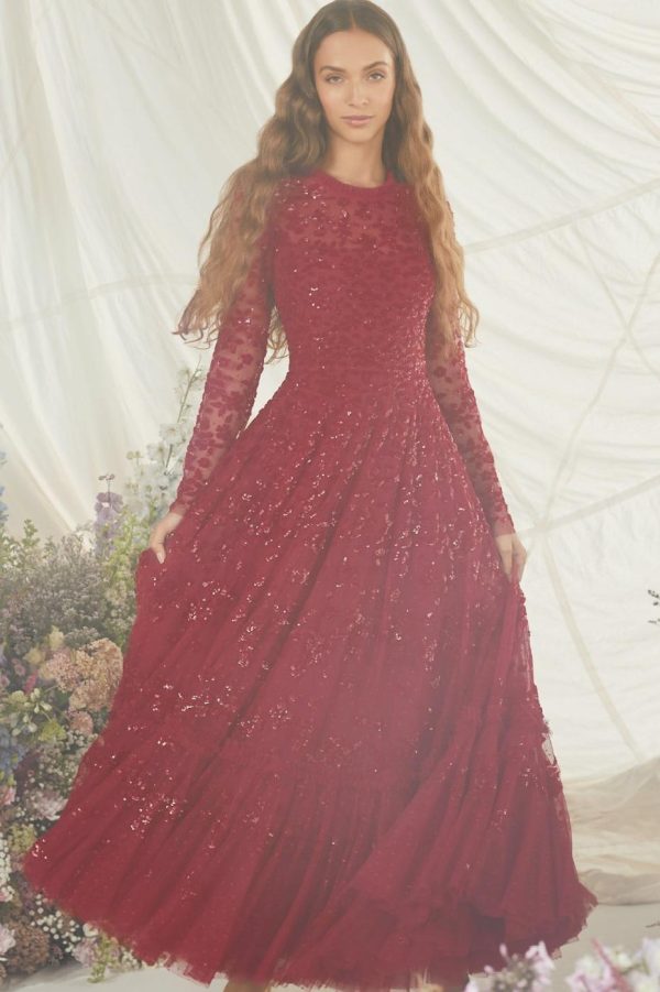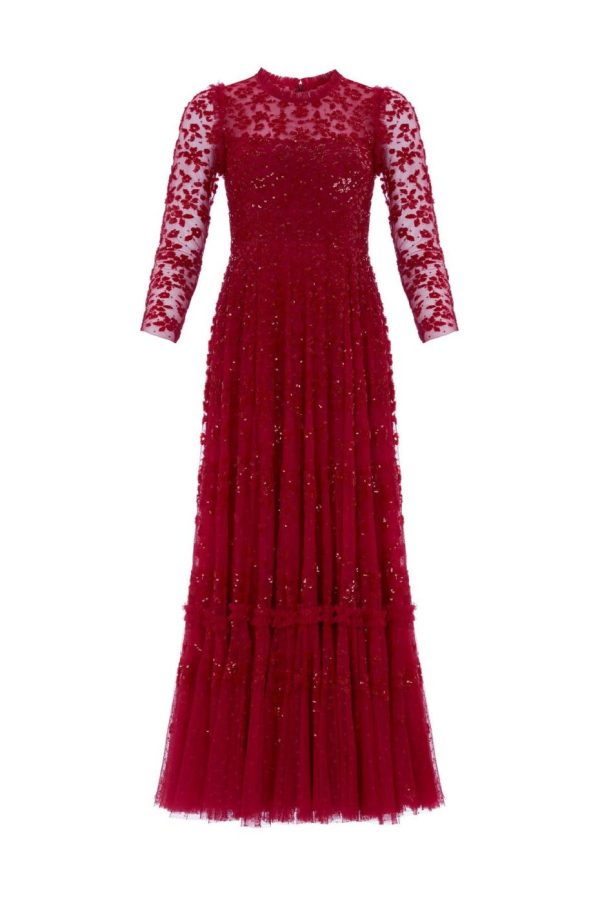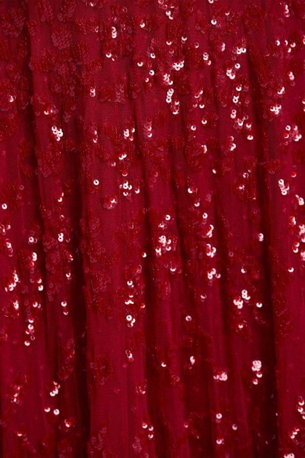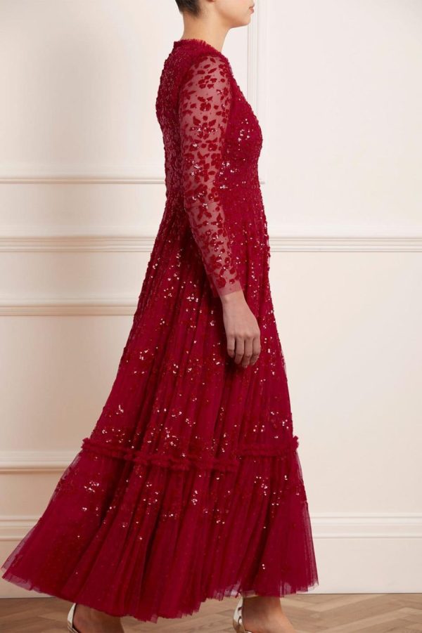 NEEDLE & THREAD EXCLUSIVE. The Margot Ankle Gown in Deep Red. This statement piece is adorned with a floral, sequin artwork creating an all over shimmer effect. Crafted with a dramatic, sweeping hemline to create romantic movement. Make a statement in this show-stopping piece.