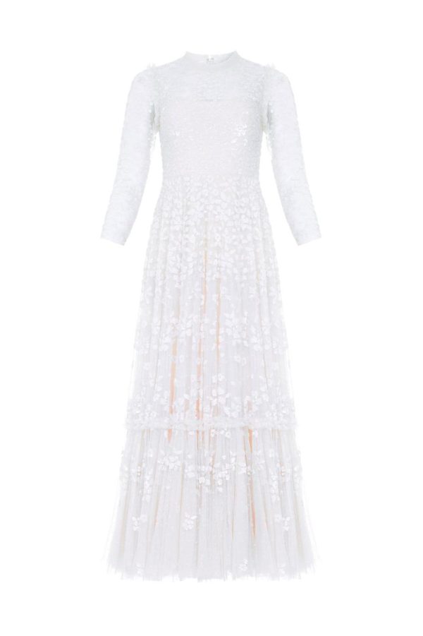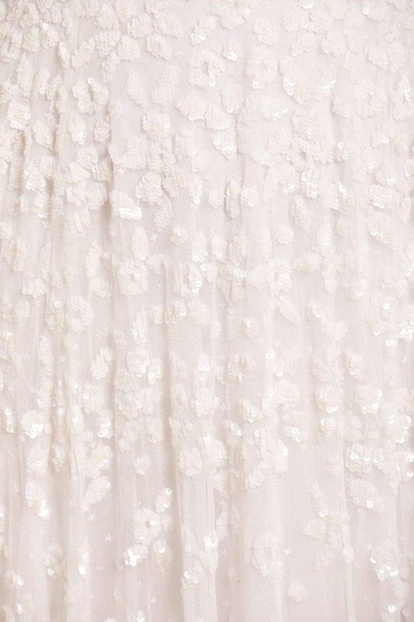 NEEDLE & THREAD EXCLUSIVE. The Margot Ankle Gown in Swan White. This statement piece is adorned with a floral, sequin artwork creating an all over shimmer effect. Crafted with a dramatic, sweeping hemline to create romantic movement. Make a statement in this show-stopping piece.