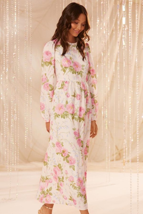 NEEDLE & THREAD EXCLUSIVE. The Rose Bluebell Ankle Dress in Moonshine. This dress features a beautiful summer print, inspired by a 1900’s hand painted artwork. Intricately designed with soft, painted roses in the prettiest, intertwining design. Crafted with a 1930’s tea-dress shape and pleat details, this dress has an effortless, easy-to-wear silhouette. Make the Rose Bluebell your new wardrobe staple.