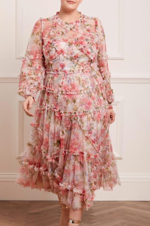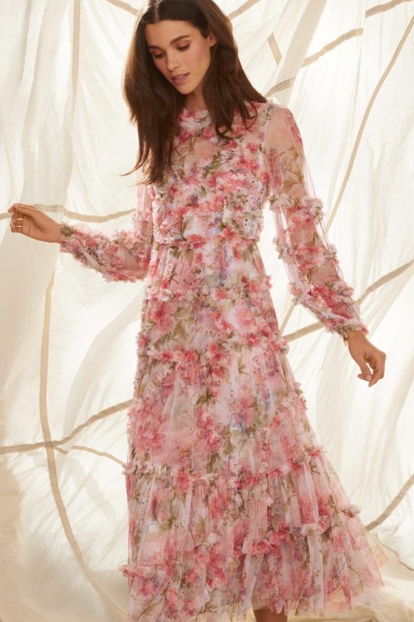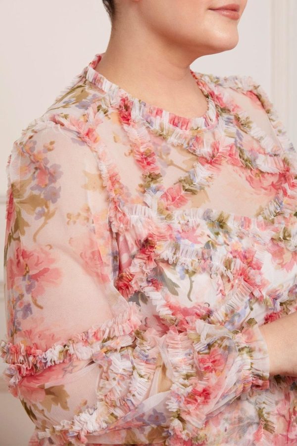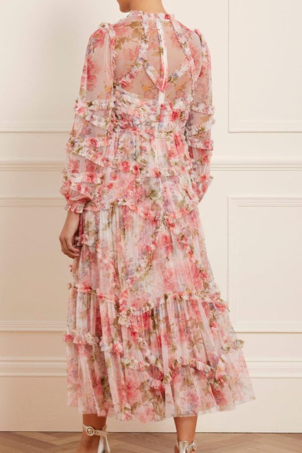 The Summer Song Diamond Ruffle Ballerina Dress in Moonshine / Pink. This eye-catching piece is crafted from delicate ruffled tulle, printed with a romantic floral artwork in sunset colours of dusk. This dress features voluminous cuffed sleeves, and has a lightly gathered skirt decorated with tulle ruffles, giving a flattering silhouette. This Victorian-inspired look with a contemporary edge will be the star of your wardrobe.