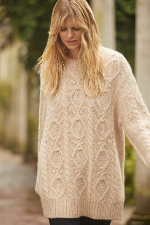 NEEDLE & THREAD EXCLUSIVE. The Sylvie Cable Longline Jumper in Birch. This premium knitwear piece is designed in a super-soft, fluffy alpaca-blend yarn. This cosy jumper is crafted with a mix of diamond-shaped cables and twists in an intricate textile. Adorned with playful flower bobbles adding a feminine texture. Designed with a relaxed fit, subtle split details and loose sleeves to create a cosy feel. The ultimate wardrobe staple this season.