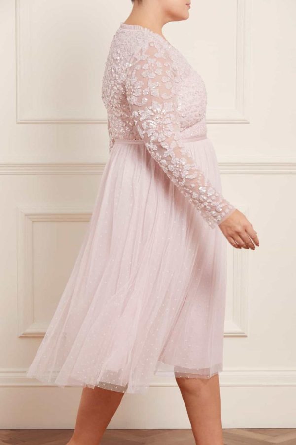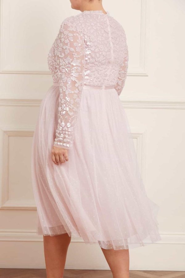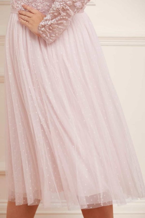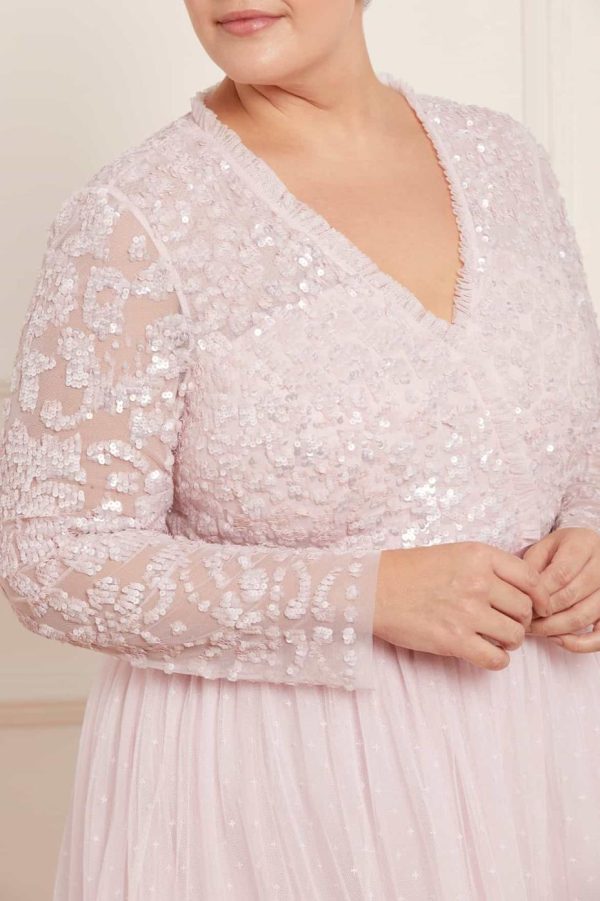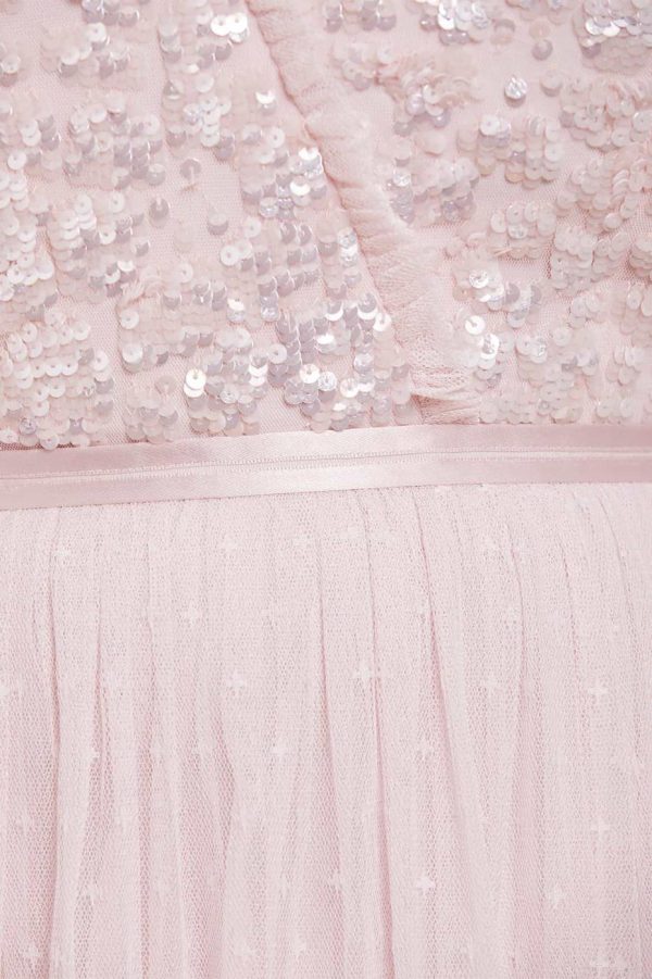 NEEDLE & THREAD EXCLUSIVE. The Tempest Bodice V-Neck Midaxi Dress in Sky Pink. This beautiful dress is inspired by a pretty vintage lace tablecloth design. The bodice is adorned with sequins, creating an all-over shimmer effect. Crafted with long sleeves, a v-neckline and a tulle multi-layered skirt. Make an entrance in the Tempest at your next event.