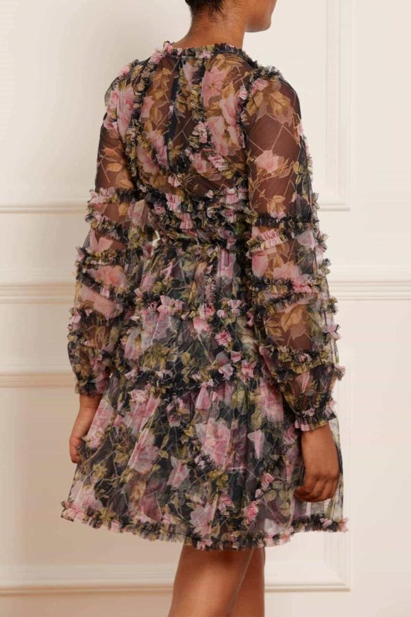 The English Rose Diamond Ruffle Mini Dress in Graphite. This mini dress is inspired by a traditional rose print taken from a 1900s hand-painted artwork, in soft hues of deep pinks. Developed with signature Needle & Thread styling featuring perfectly engineered frills for all-over delicate texture. The perfect mini dress to take you from dinner to the dancefloor.