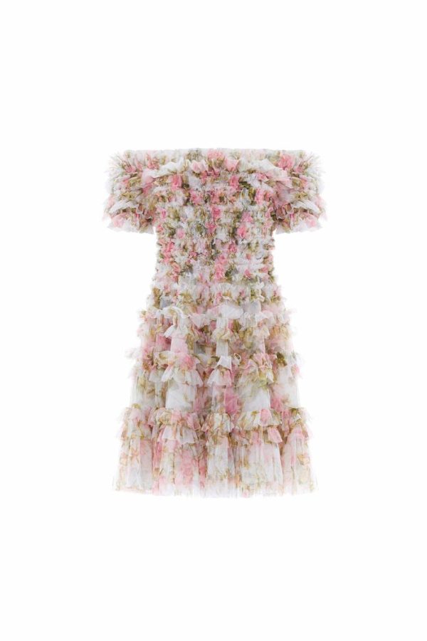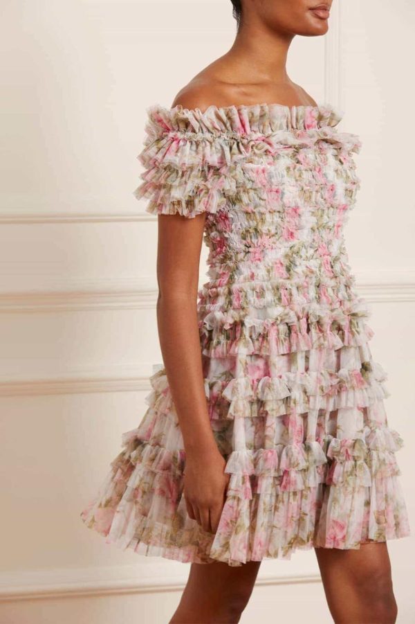 The English Rose Lisette Micro Mini Dress in Moonshine. This mini dress is inspired by a traditional rose print taken from a 1900s hand-painted artwork, in soft hues of deep pinks. This statement dress has an elegant off-the-shoulder design inspired by Hollywood styling. Crafted with textile tulle and double-stitched frills for a dramatic, romantic effect. Featuring an integrated corset for a perfect fit and to hold the silhouette. Expect all eyes on you in this romantic dress.