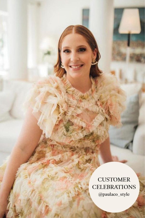 The Genevieve Rose Gown in Moonscape. This statement gown is inspired by 1930s Hollywood glamour. Beautifully designed in a harlequin rose print with diamond tulle details. Crafted with multiple layers of ruffled, frothy tulle sculpted for dramatic effect. Make the ultimate style statement of the season.