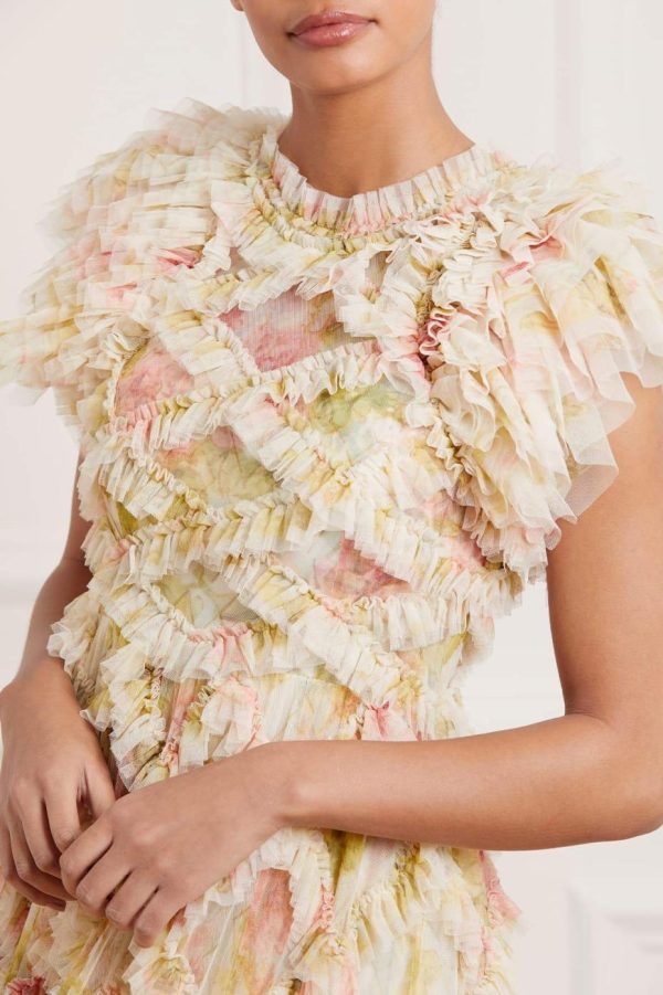 – Printed tulle decorated with layers of printed tulle ruffles.