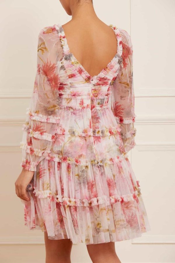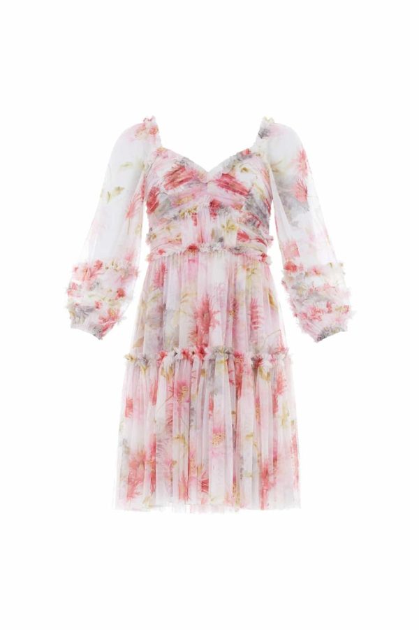The Hummingbird Iris Bloom Mini Dress in Moonshine. This enchanting dress is printed with wild blooms in vivid, soft and bright tones, creating a playful wild nature artwork. Designed with a flattering gathered silhouette and panelled bodice creating romantic movement. This pretty piece is crafted with layers of soft tulle and tiered with ruffle trims. The perfect dress to be event ready.