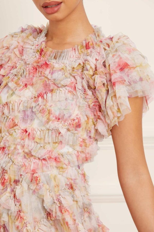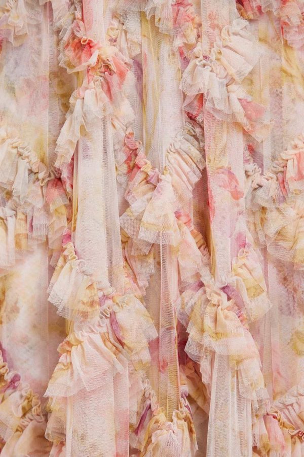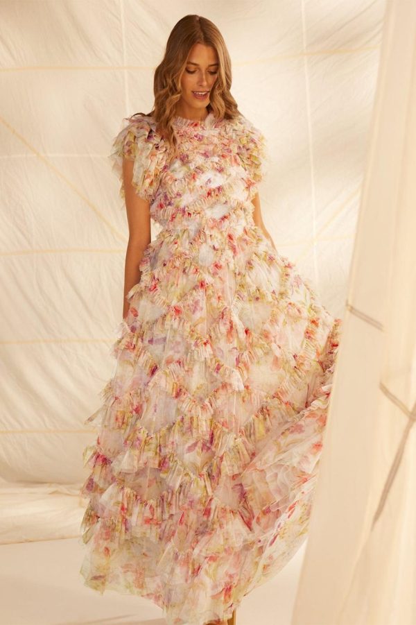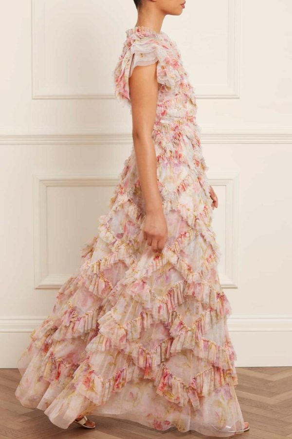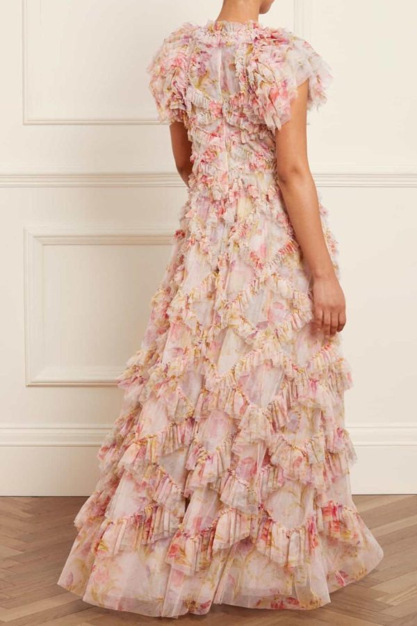 The Iris Genevieve Gown in Moonshine. This signature Needle & Thread gown is printed with colourful iris flowers and delicate daisy motifs, inspired by a 1900s hand painted print. Beautifully designed with diamond tulle details and trims to create an all-over frothy texture. This gown has been crafted with dramatically layered ruffle sleeves, inspired by 1930’s Hollywood glamour. This beautiful gown guarantees to deliver timelessness and style.
