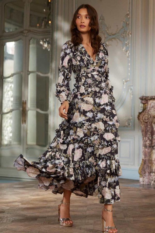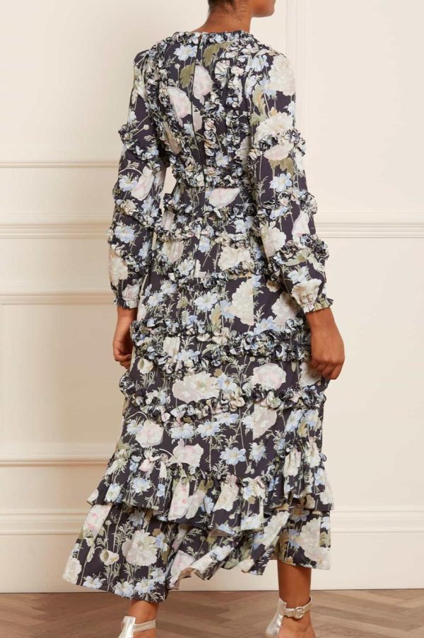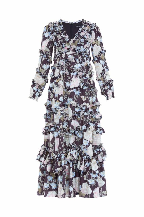 NEW SEASON. The Moonlight Petals V-Neck Crepe Ankle Gown in Graphite. The print of this dress is taken from a 1900’s hand-painted artwork. Beautifully printed with soft white peonies and silvery blue wildflowers creating an enchanting print. This ankle gown is adorned with ruffles creating signature Needle & Thread detailing. Crafted on soft crepe fabric for an easy-to-wear piece. You can dress the Moonlight up or down depending on the occasion.