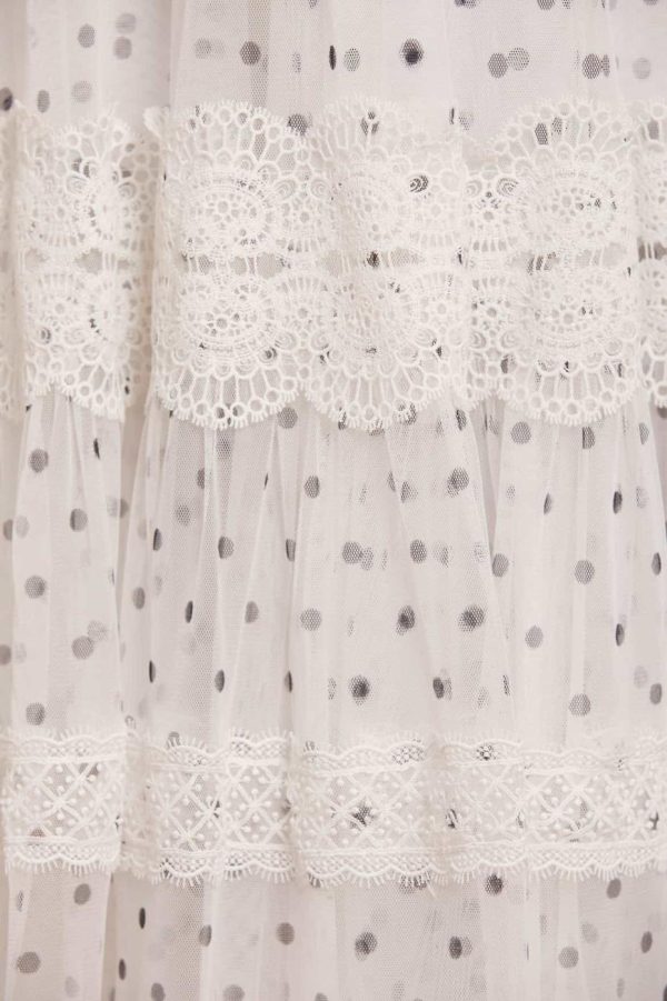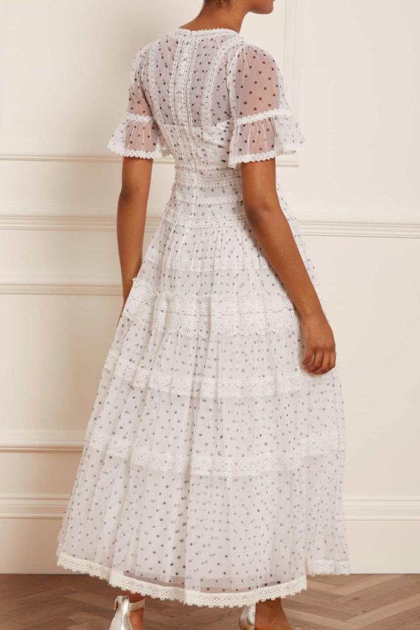 The Polka Dot Lace Ankle Gown in Moonshine / Graphite. Beautifully designed with a playful yet elegant polka dot print, inspired by the early 1900’s. The dress features intricate lace trims bordering throughout in various shapes and designs. The perfect gown to take you from day to night.