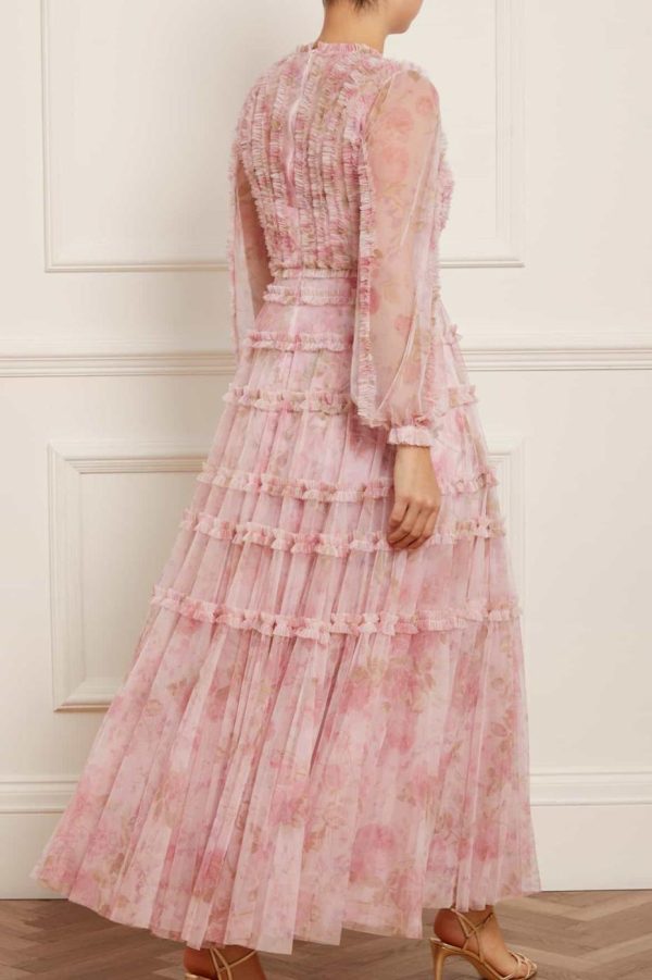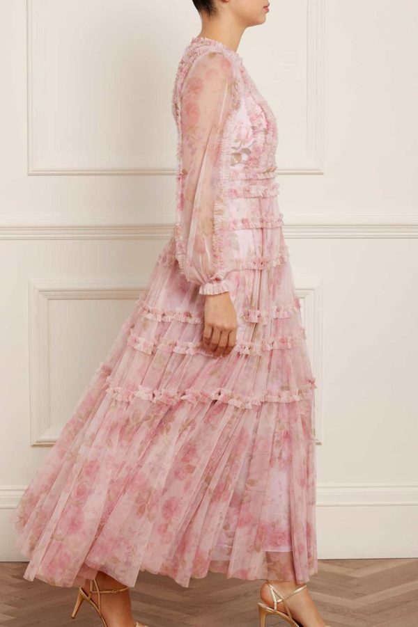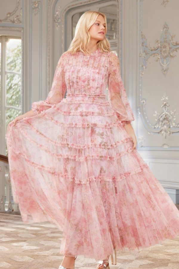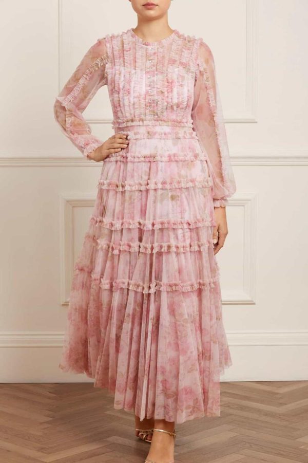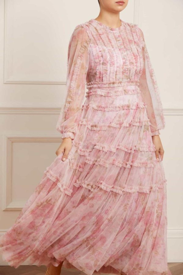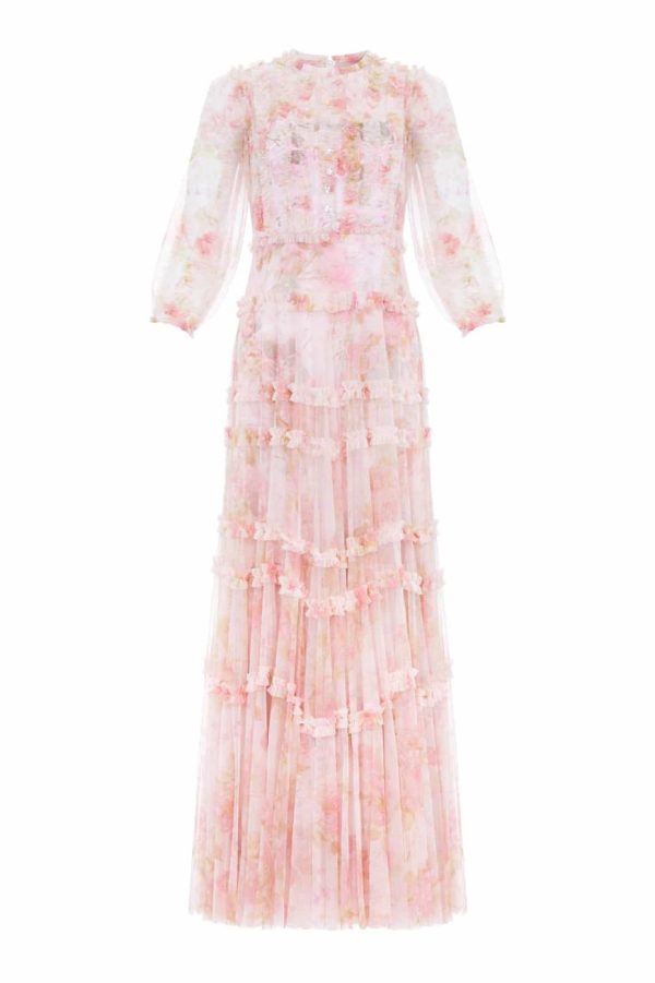 The Rose Bluebell Esme Gown in Tinted Pink. This long sleeve gown has been beautifully designed with a whimsical print of soft pink roses with delicate bluebells, taken from an 1800s hand-painted floral artwork. The gown has a Victorian-inspired silhouette featuring delicate, shimmering embellishments as mock buttons down the front bodice. The voluminous skirt has been crafted from circle-cutting panels, creating a tiered edged for romantic movement and texture. The perfect gown for your upcoming occasions.
