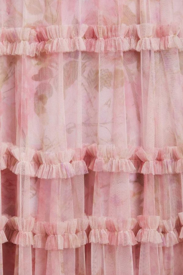 – Floral printed tulle decorated tulle frills and floral embellishment at the centre front of the bodice