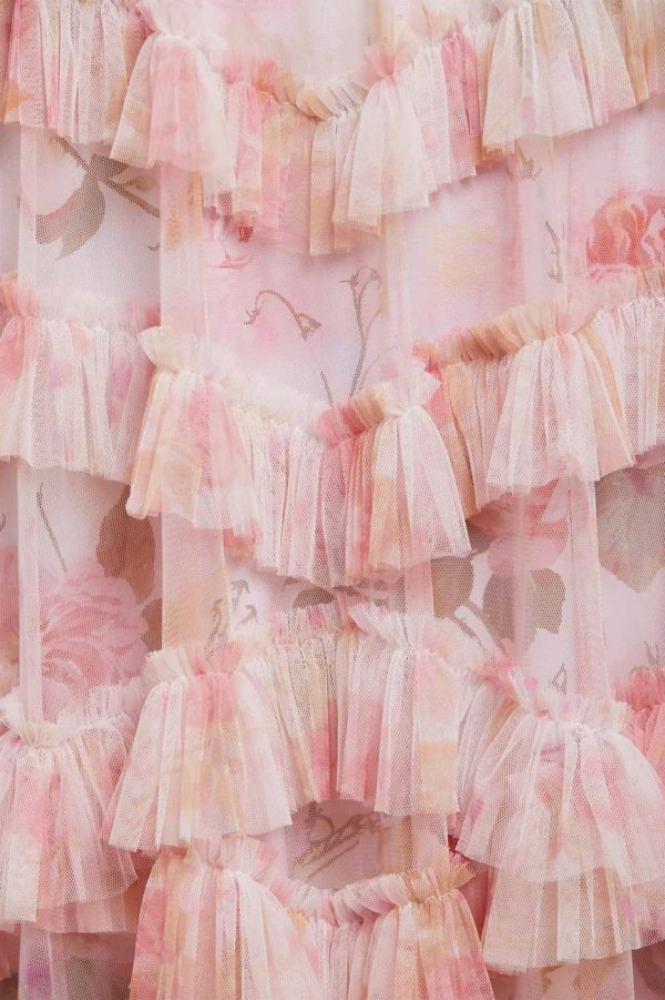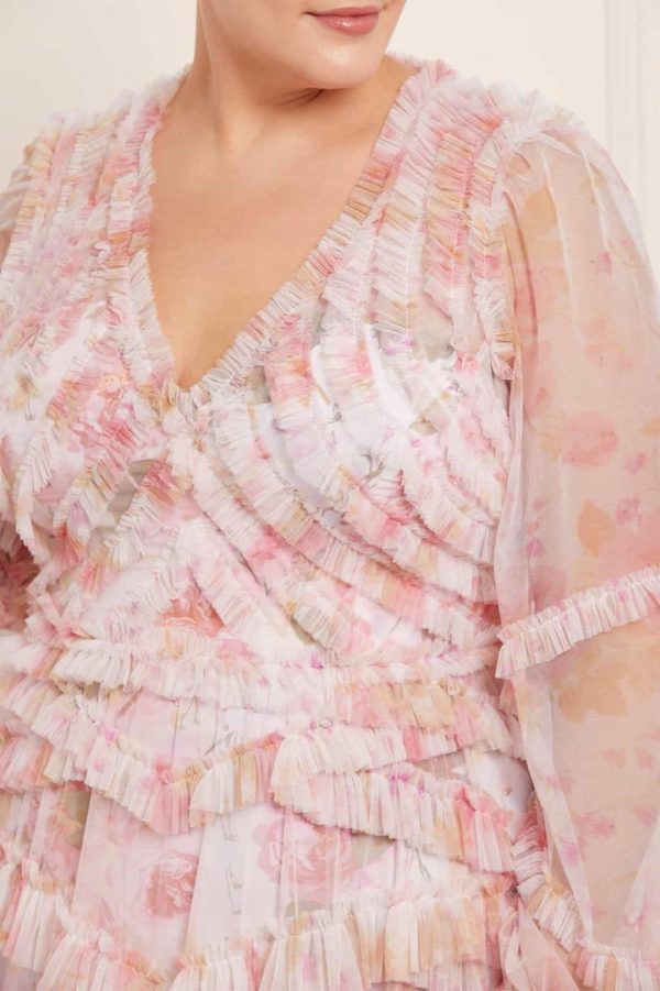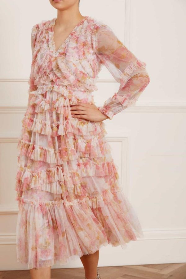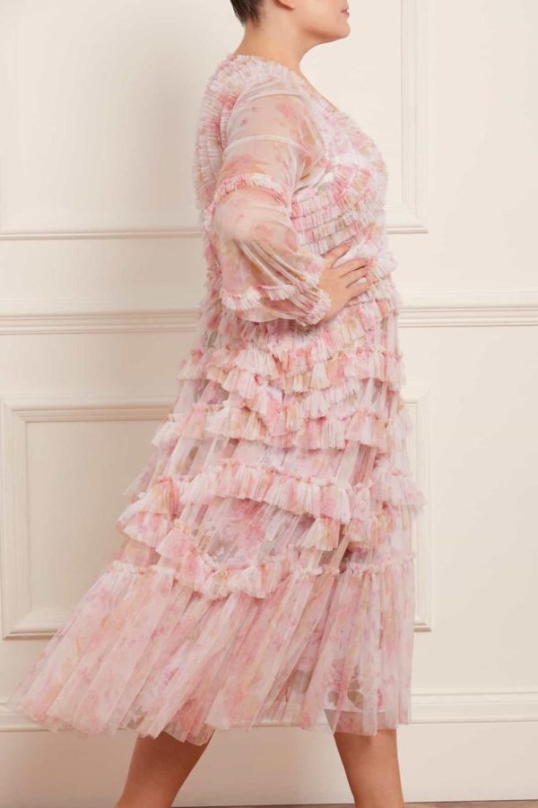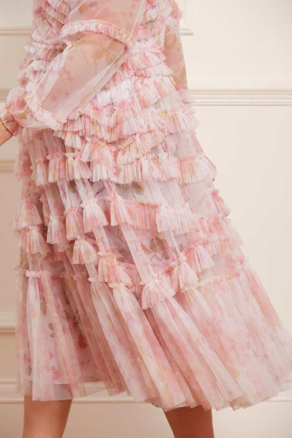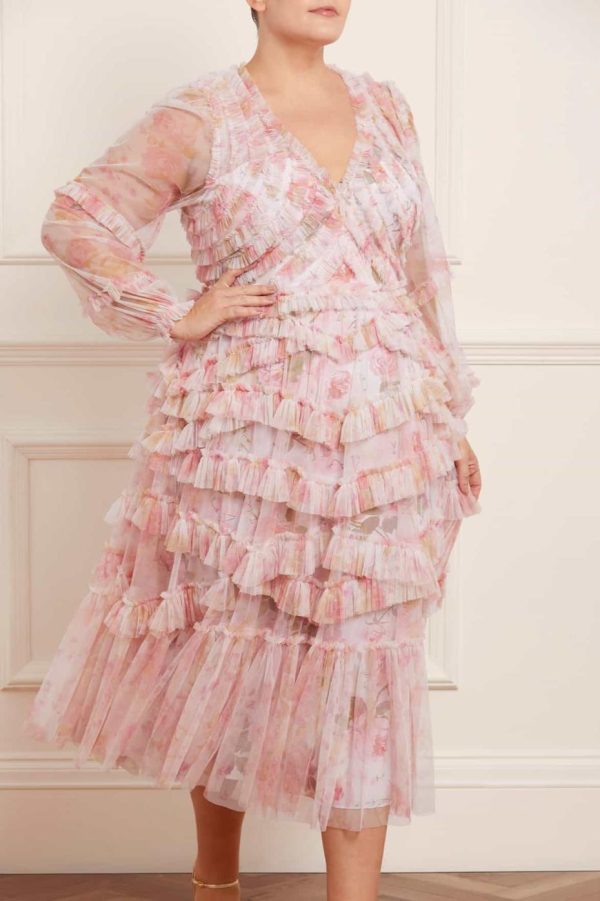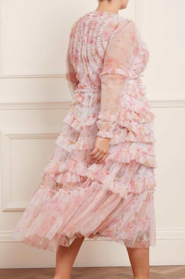 The Rose Bluebell Ruffle Ballerina Dress in Moonshine. Beautifully designed with a whimsical print of soft pink roses with delicate bluebells, taken from an 1800s hand-painted floral artwork. This signature Needle & Thread style is crafted with voluminous cuffed sleeves and a flattering skirt that skims the body and gradually increases in fullness, creating stunning movement as you walk. This Victorian-inspired look with a contemporary edge will be the star of your wardrobe.