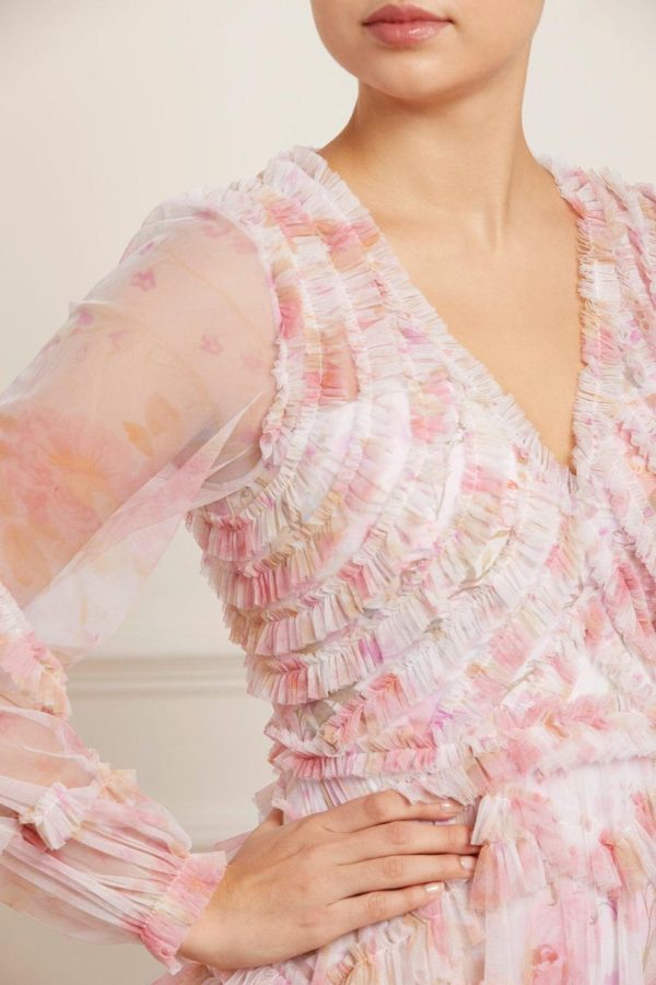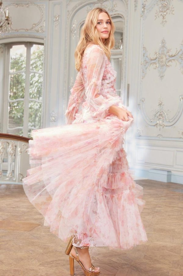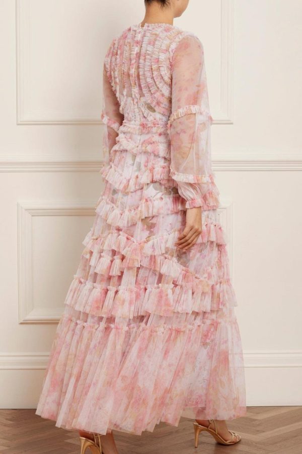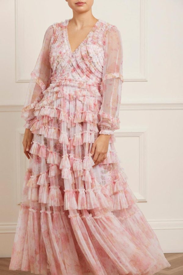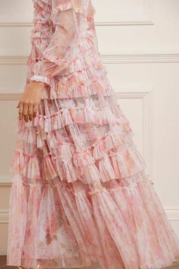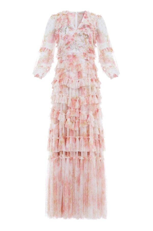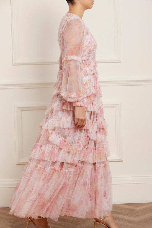 The Rose Bluebell Ruffle Gown in Moonshine. Beautifully designed with a whimsical print of soft pink roses with delicate bluebells, taken from an 1800s hand-painted floral artwork. This signature Needle & Thread style is crafted with voluminous cuffed sleeves and a flattering skirt that skims the body and gradually increases in fullness, creating stunning movement as you walk. This Victorian-inspired look with a contemporary edge will be the star of your wardrobe.
