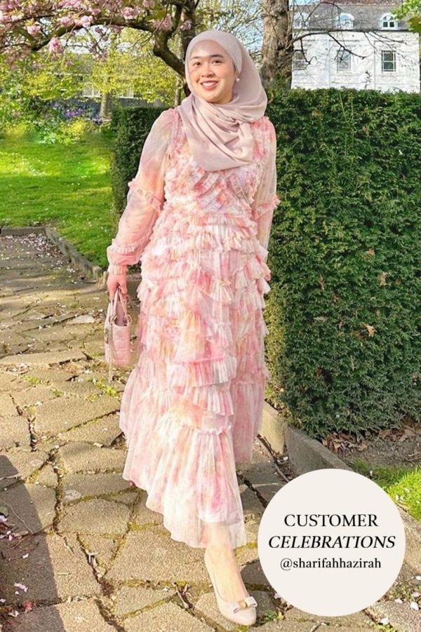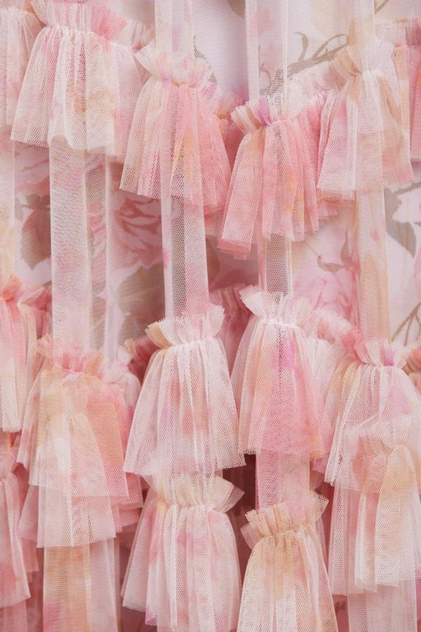 – Tonal floral printed tulle with tulle ruffles