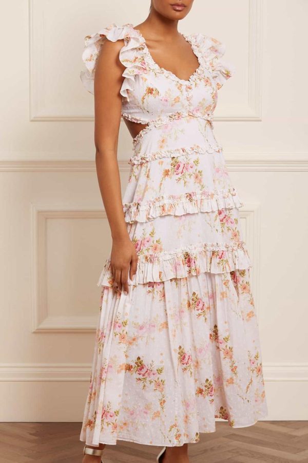 The Trailing Blooms Cotton Backless Ankle Gown in Moonshine. This beautifully printed gown is designed with a floral motif in soft pink tones, inspired by a hand-painted 1900’s artwork. Developed on our soft cotton fabric featuring subtle dobby weave to add gentle texture. Adorned with pretty tulle details, frills and signature detailing for a romantic edge. Beautifully created with a striking silhouette and shaped with a backless design for further intrigue. Style with an on-trend ribbon in your hair to complete the look.